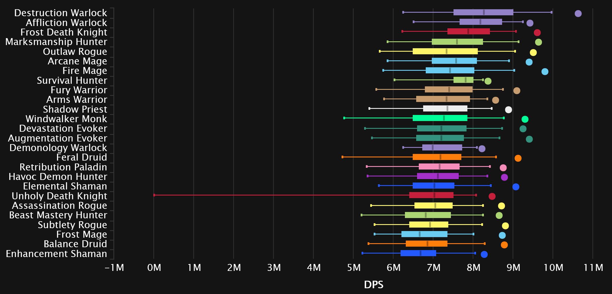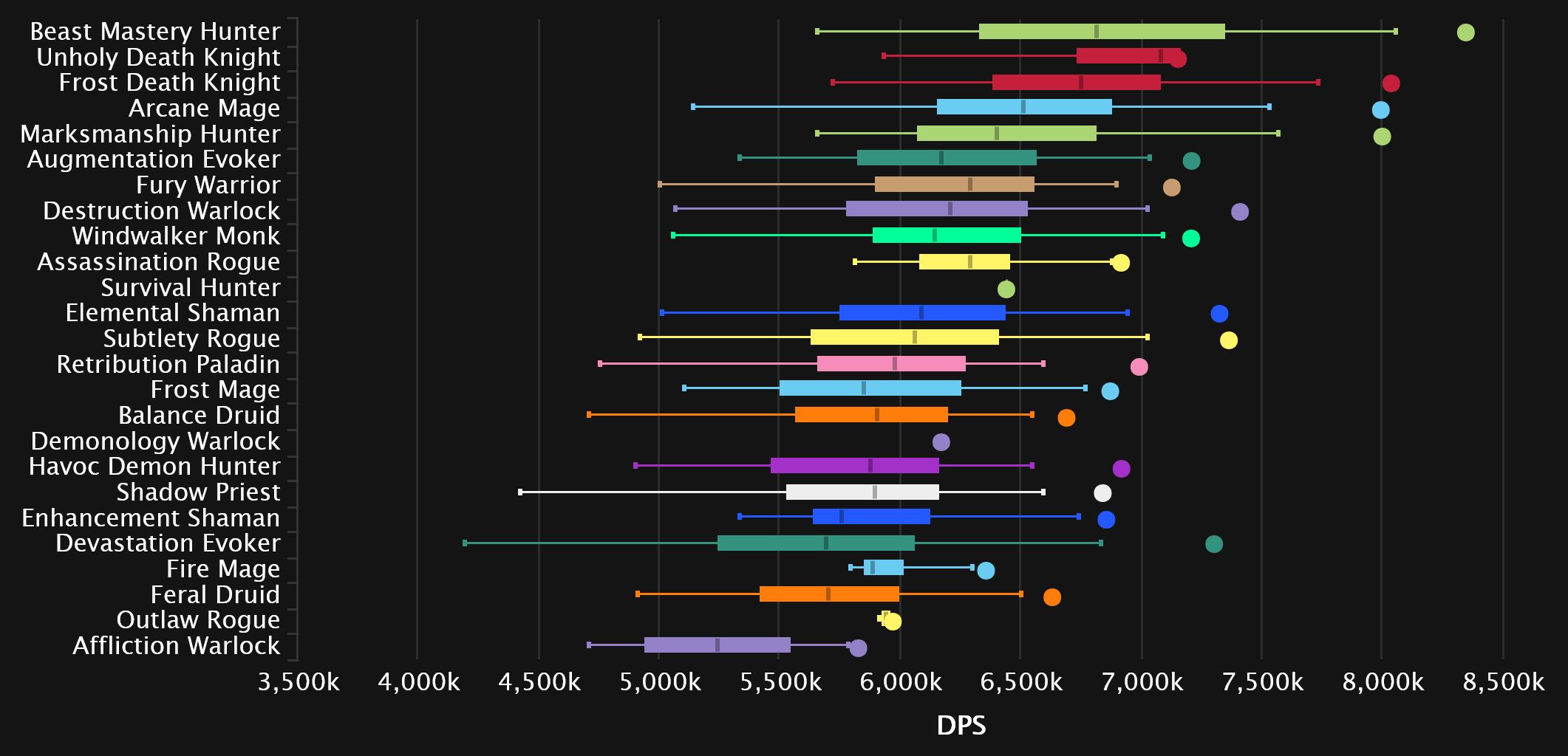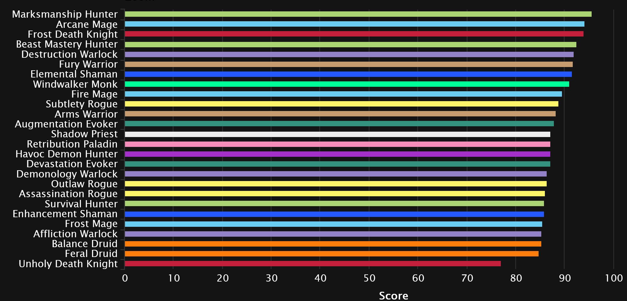We have a very eventful week in the Manaforge, as Beast Mastery is still rising, showing no signs of slowing down. We also see Unholy drop like a stone, possibly due to one single terrible log on the final boss, right down to dead last. Destruction lost quite a few spots the old-fashioned way, and Affliction dropped out of the top entirely. Let’s dive in.