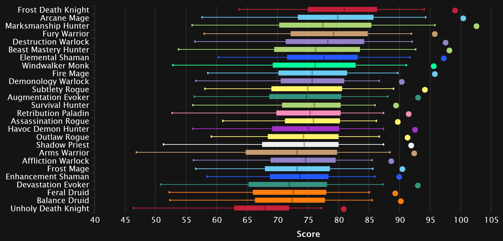 While Fury and Elemental drop one to accommodate the new Hunter, Windwalker rises one, beating Fire out of that No.8 spot. Subtlety reminds everyone it still exists and grabs the final top 10 slot, moving three up. We see a brand new face not only in the bottom 3, but at the bottom itself! Unholy fell off a cliff this week, as not only did it drop 8 spots, it also went from a high 80s score to the 70s, the only spec to do so here. There is one particularly terrible log on Dimensius, which is most likely messing with this, which we’ll see later on.