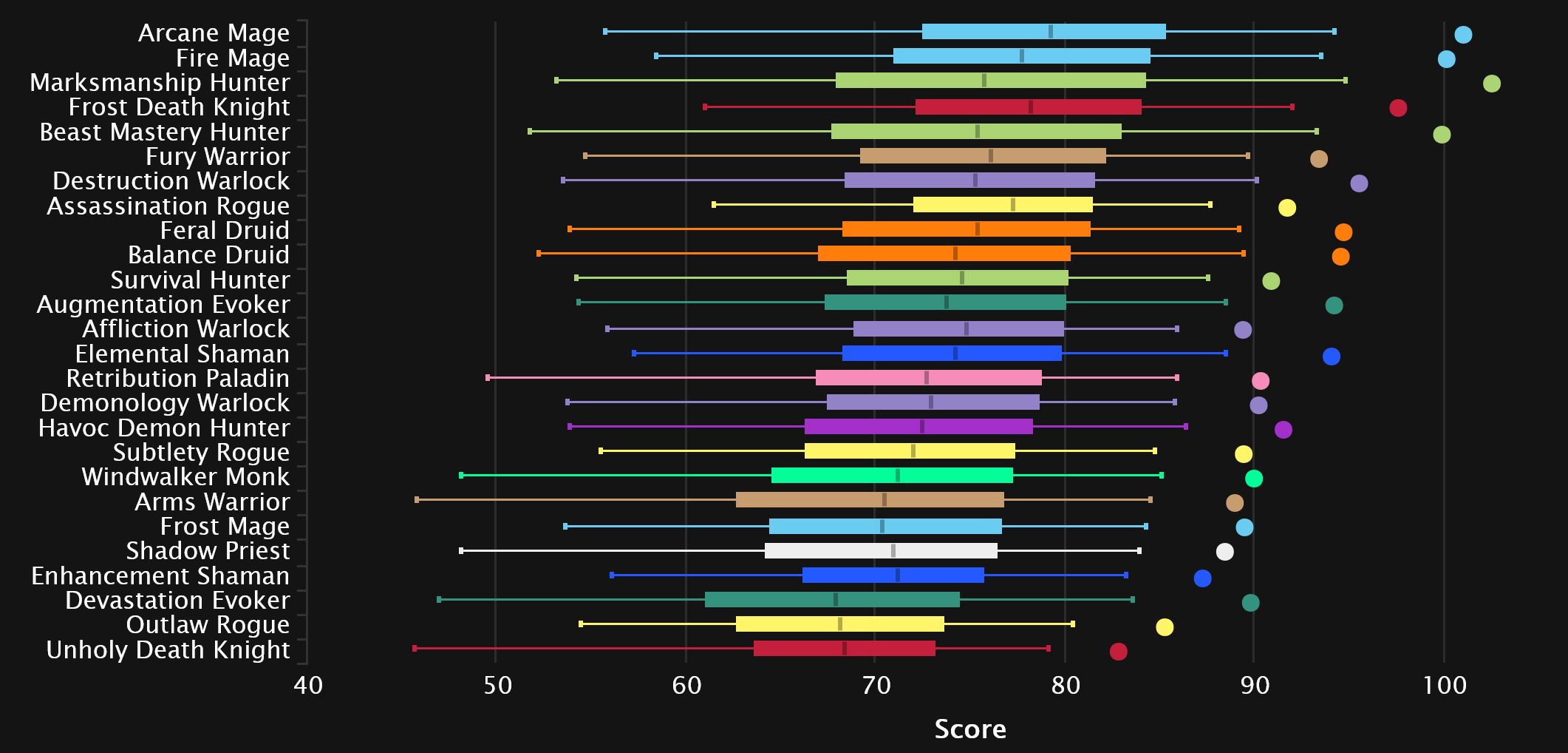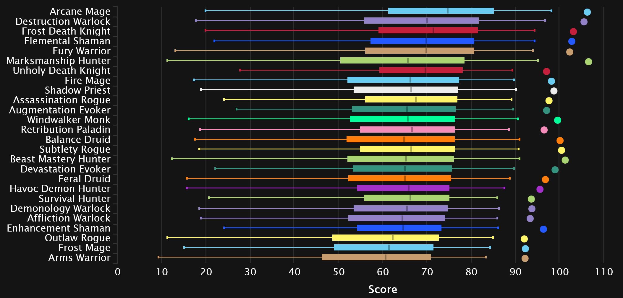 Note: We are using normalized scores instead of raw DPS for the Warcraft Logs rankings. Normalized scores take into account the outlier boss fights where certain specs could stack massive DPS (due to the nature of the fight, whether it’s AoE spam or something else), which would then affect their overall score for the whole raid.