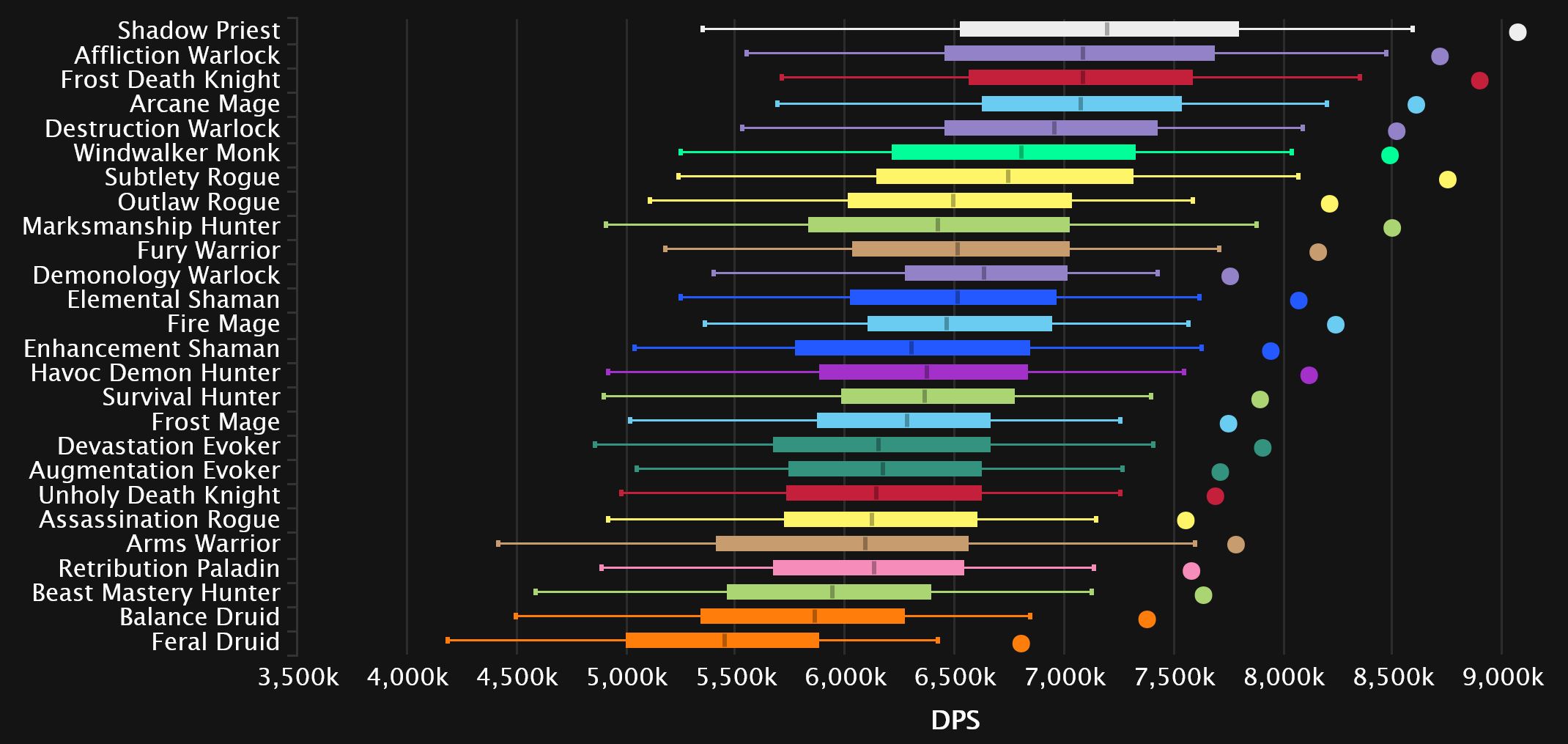 Destro isn’t going anywhere in Heroic, at least for this week. Marksmanship moves one up, passing a still very much present Unholy. Shadow closes out the top 10, and we see a very different bottom 3 here, with Arms in dead last, and Frost Mage and Outlaw joining it down in the dumps.