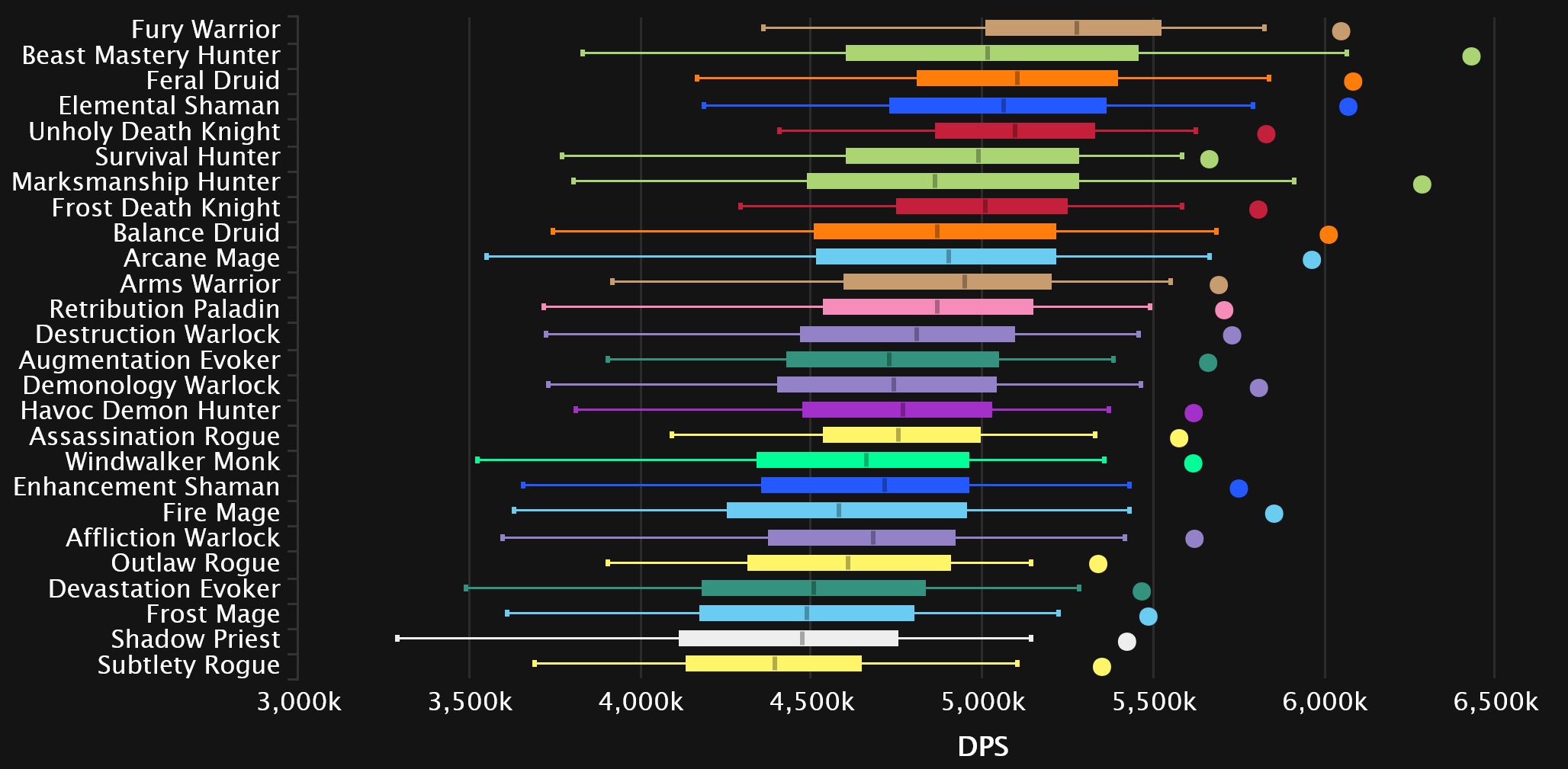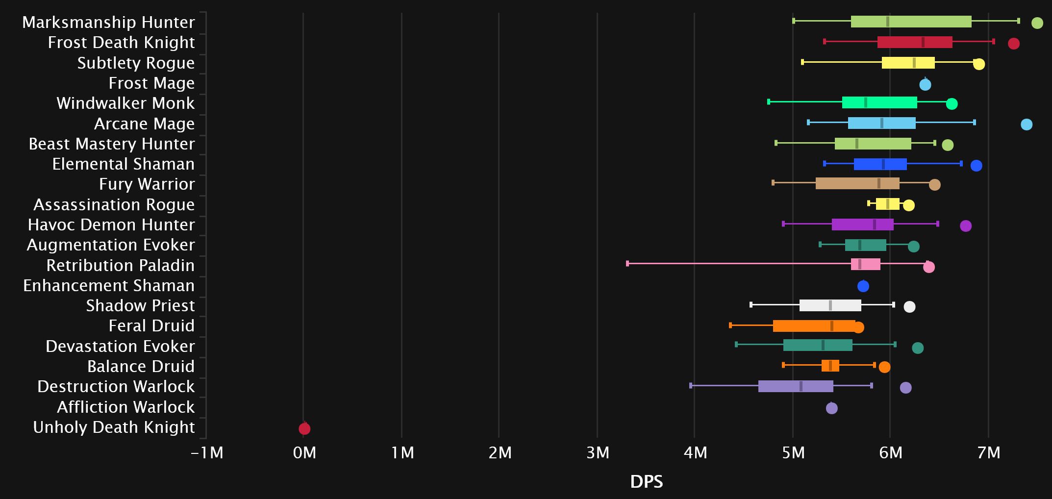 Affliction may have dropped off the face of the earth in the overall logs, but it’s still doing really well on Forgeweaver and Soul Hunters. We see Beast Mastery start to show up in the higher spots at Fractillus, but all three Hunters are doing great there. We’re still in tiny log amounts territory for the final two bosses, but we can see that weird Unholy log on Dimensius very clearly, coming in at almost 0 damage done. BM was already on top on Nexus-King before this week, so no changes there, and we see Marksmanship take things over on the final boss.