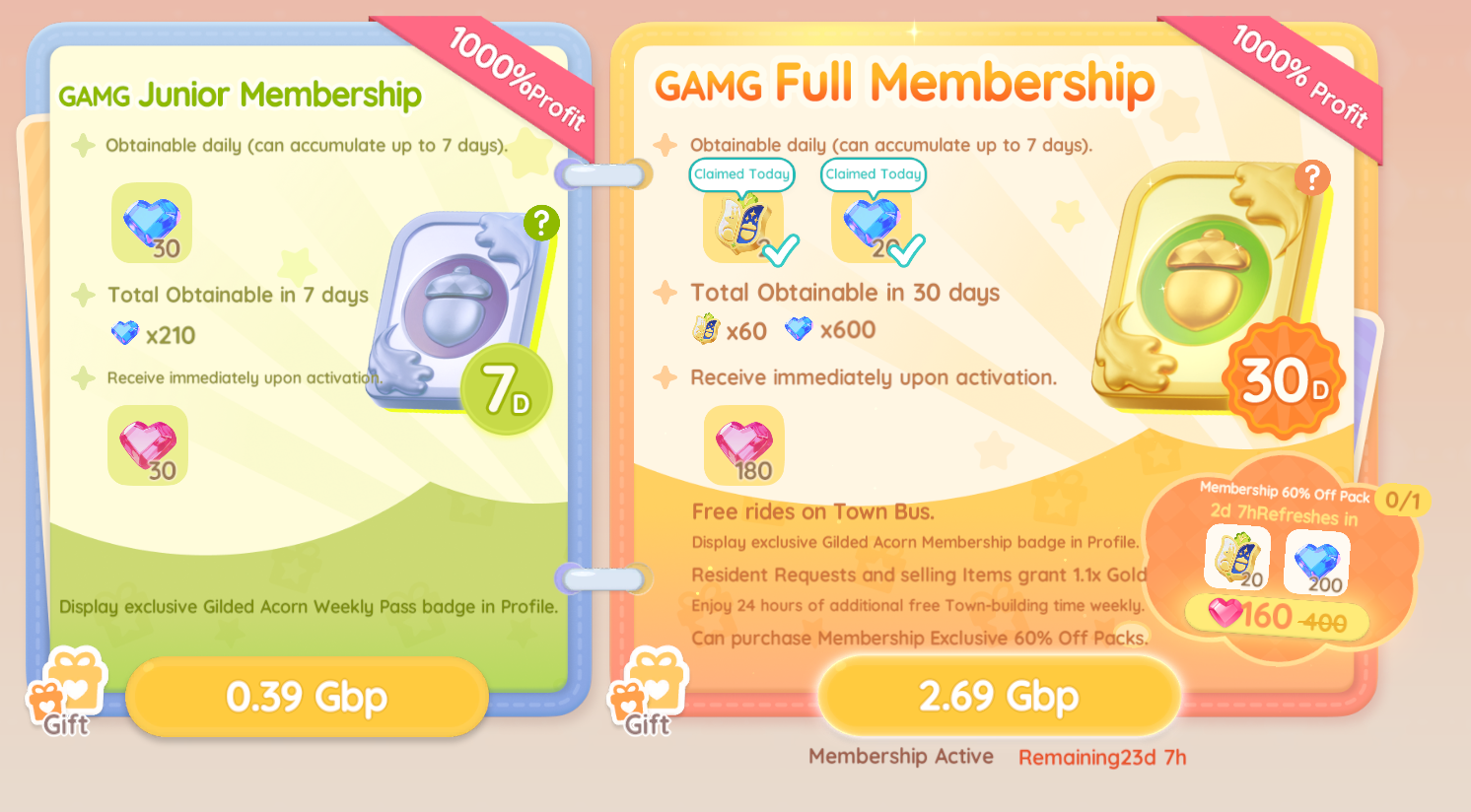 In addition to buying Heart Diamonds, players can also purchase a 7-day or 30-day membership, known as GAMG Junior or GAMG Full Membership, at a low cost. Memberships provide a one-time bonus of Heart Diamonds, daily login rewards in the form of Moonlight Crystals, and additional in-game benefits. Moonlight Crystals can be used for select gacha options, as well as certain store items and cosmetics.