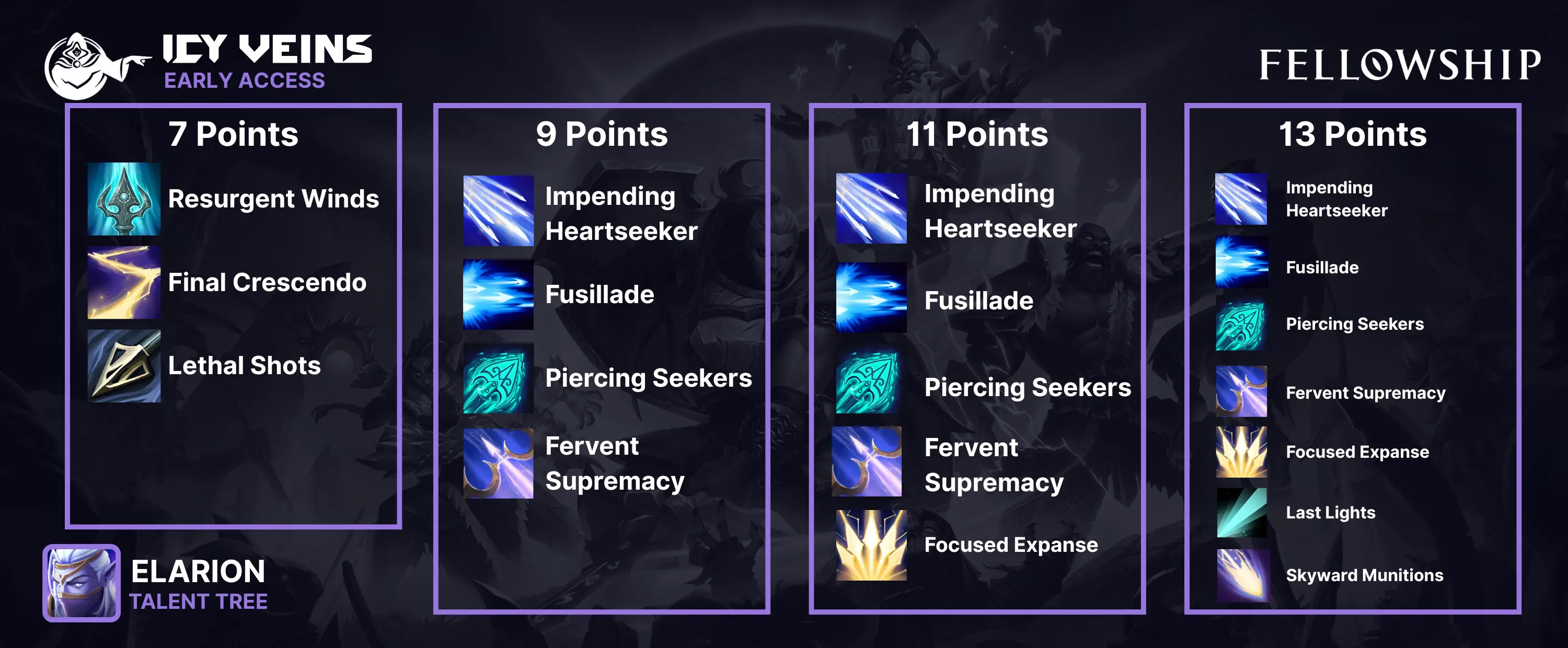 Elarion has a couple of viable choices for talent builds. We are suggesting a Highwind Arrow build to start with when you have few talent choices and lower stats. But as you get more talent points we shift over to a Heartseeker Barrage focused build for it’s Spirit Ability synergy and priority damage. We’re also making sure to pick up the Multishot talents for greater AoE potential.