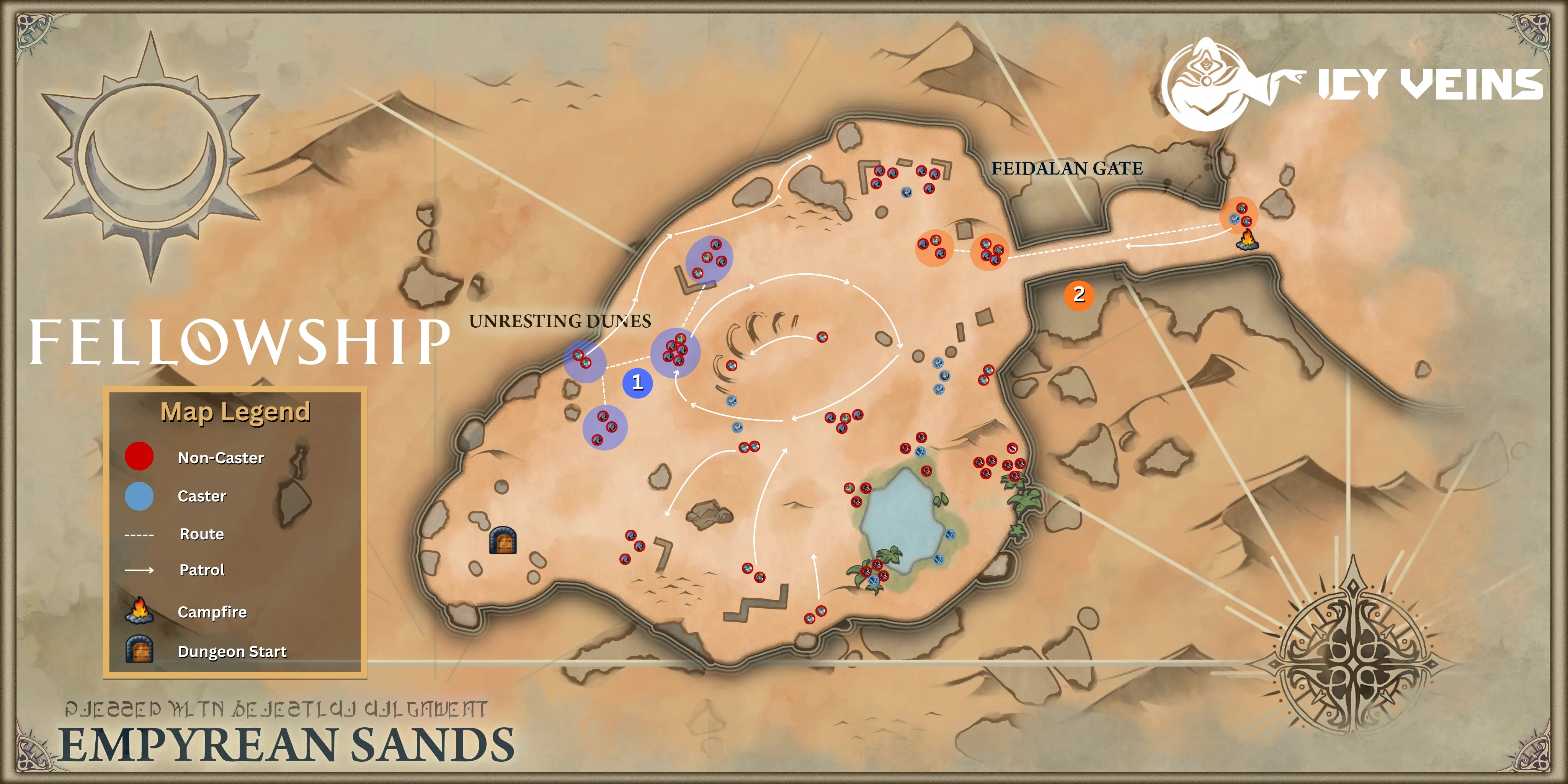 1. This is going to be the hardest pull in the dungeon. You can use the ruins on the left with the final group (two Sandsworn Husks, one Gravebreaker Brute, one Dunesnare Hunter) to grab to LoS the ranged mobs. The ranged mobs should bunch up close enough for your party to hit them with their AoEs/cleave abilities. Avoid all enemy abilities the best you can.
