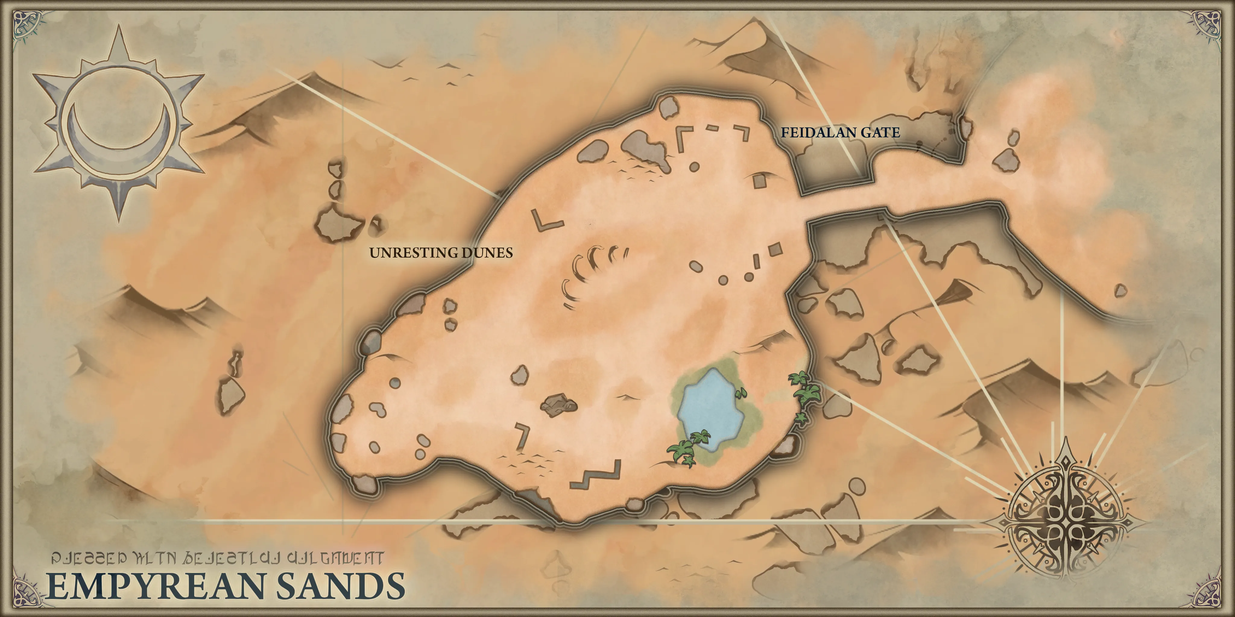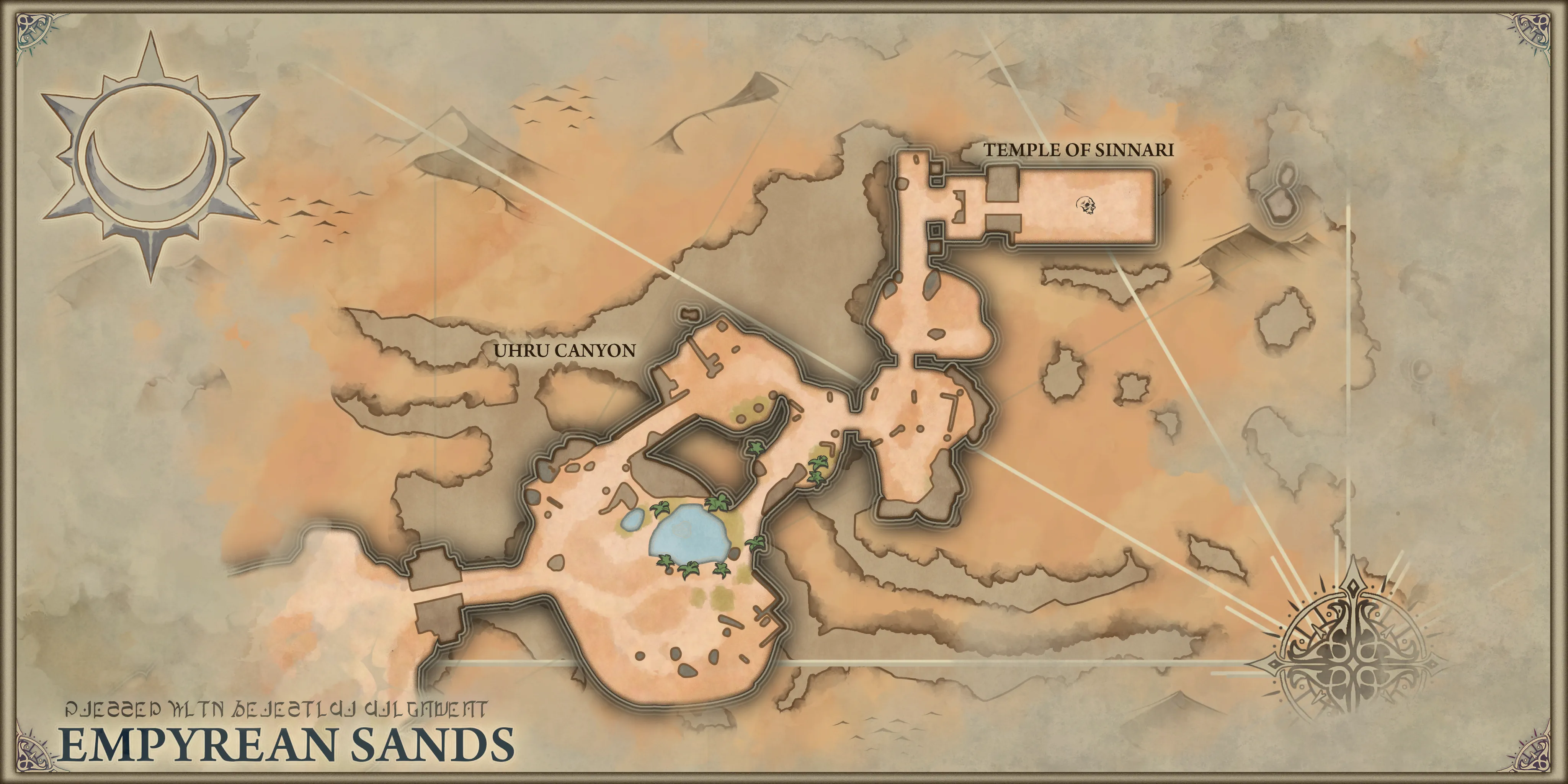 Empyrean Sands is set among sandy dunes and the ruins of an ancient temple. At the heart of the temple, Sin-Magir rises in the night, empowered by the constellations and light of the moon. His followers gather within the dunes nearby, threatening to discover the celestial relic that would restore their empire.