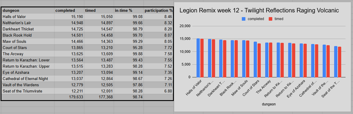 The global share of Chinese players’ activity has fallen to a seasonal low point in week 20. Just 41.10% of all runs can be attributed to the region. So far, we don’t have much data on activity on the Titan Reforged servers. For now, this variety shifts focus away from Retail WoW. Maybe this model is worth a try on the Western servers.