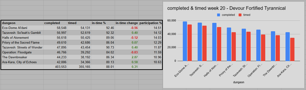 By now, the overall split has almost created a two-tier system. The three most popular dungeons were quite ahead of the rest. The order had reverted to the regular pattern, with Ara-Kara once again sitting in last place. A slight improvement happened for the average success rate by 0.31 percentage points to 88.01%. Groups can deal with the Devour affix much more easily. This might be the reason it will get buffed in S1 of Midnight.