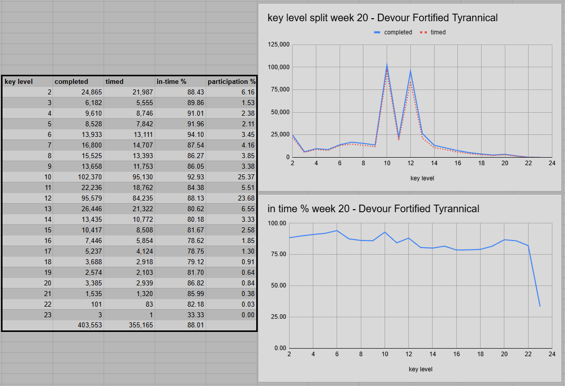 The overall increase in the success rate was quite visible for the lower key levels. But the step down from level 6 to 7 (-6.5 points) and the step up from 9 to 10 (+7 points) were as prominent as ever. The impact of the first Fortified or Tyrannical affix is still massive and quite a hurdle for new players.