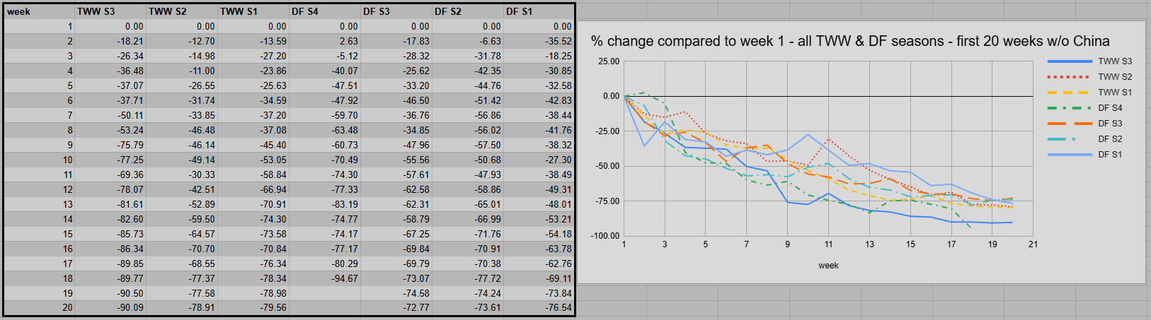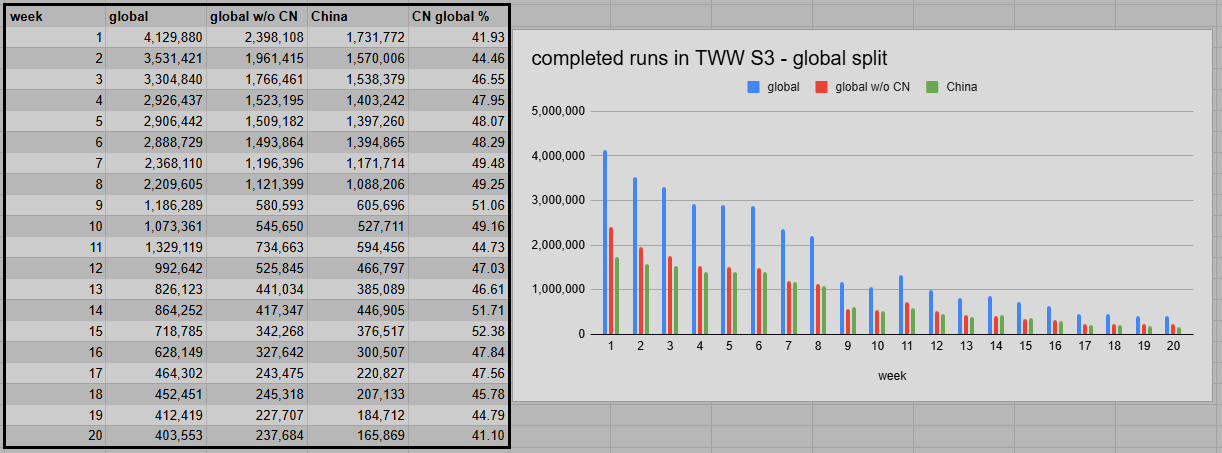 The global drop-off of 2.15% once again reflects different patterns across the major regions. Chinese metrics were 10.20% lower compared to the previous week, a steady trend for now. Meanwhile, the remaining four regions showed an uptick of 4.38%. Compared to prior seasons, TWW S3 is still well behind, but remains about as steady as they were in their final weeks.