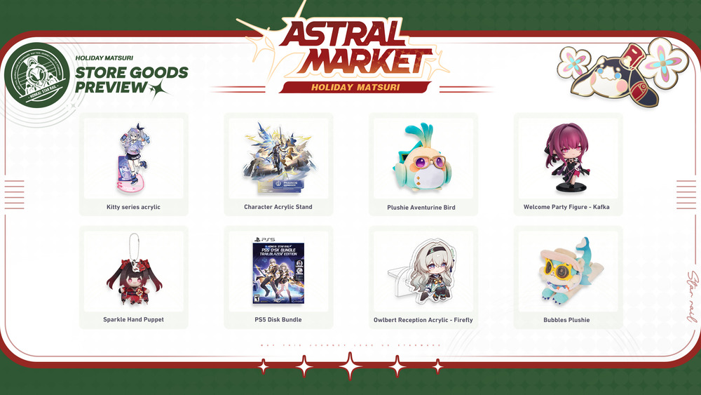 The Holiday Matsuri Astral Market lineup features a mix of cute collectibles and premium items for Honkai: Star Rail fans. Highlights include: