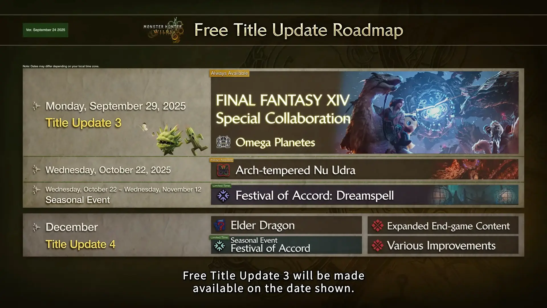 On top of Title Update 3 dropping end of September, Capcom has also released their latest updated Roadmap, showcasing the future content, including Elder Dragons for December 2025 with Free Title Update 4, featuring the formidable Gogmazios!