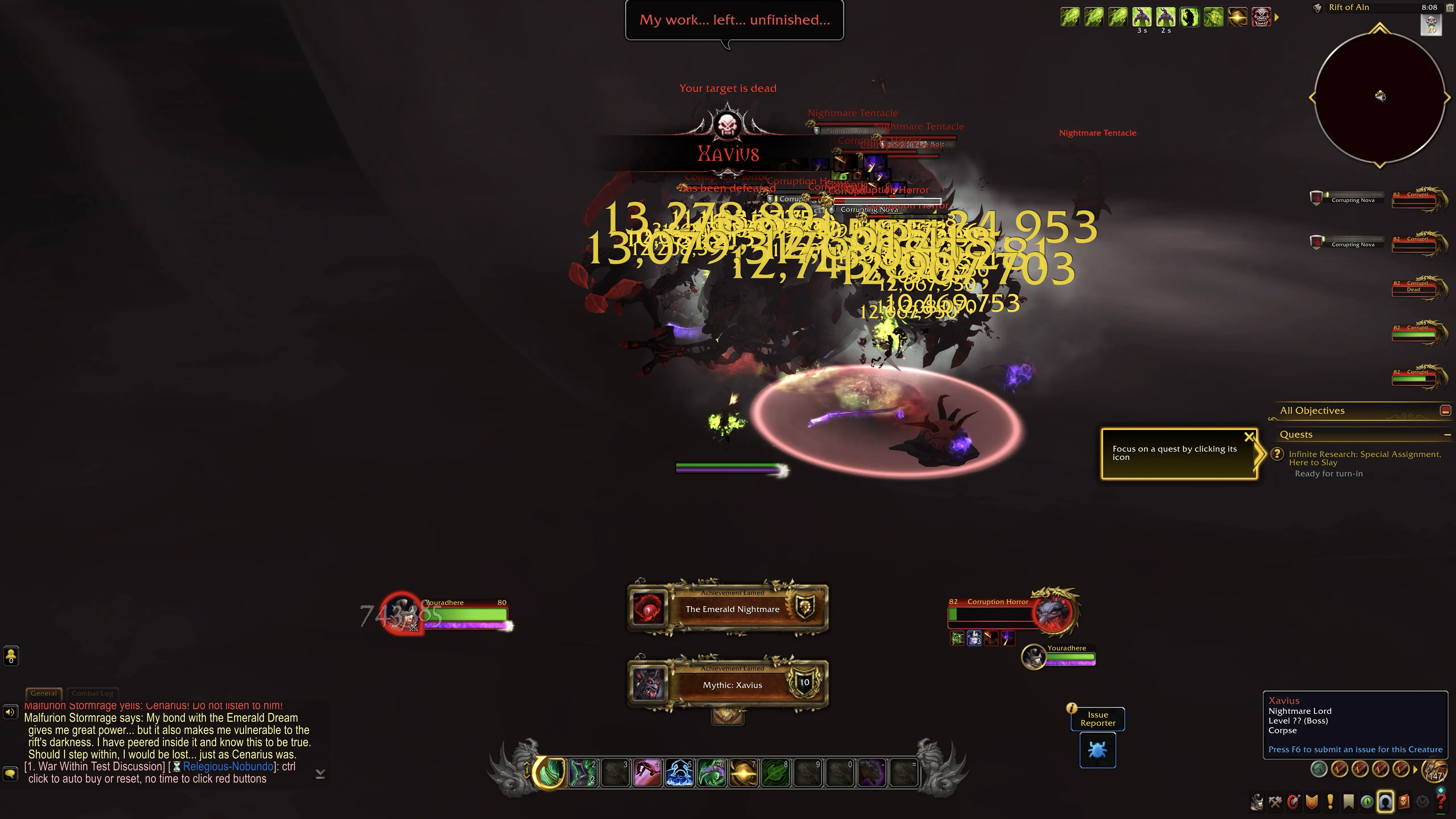 With 999 points in the Infinite Artifact trait and ilvl 740 gear, it’s impossible to die and soloing Mythic raids is super easy. Here, we’ve cleared Mythic Emerald Nightmare and it was impossible to die (quite literally). Here’s a shot of Mythic Xavius dying in less than a minute.