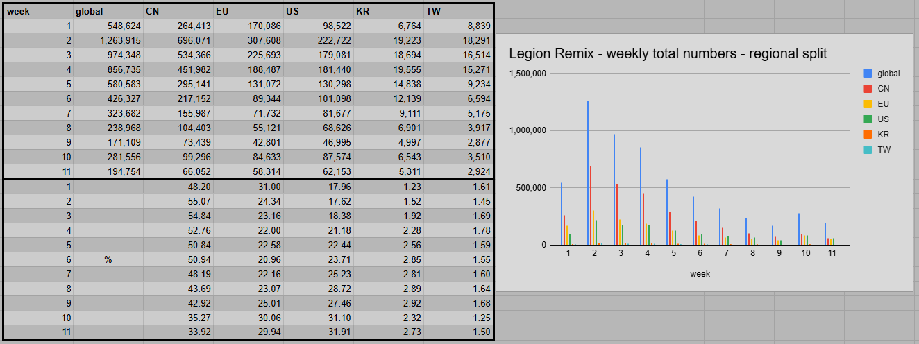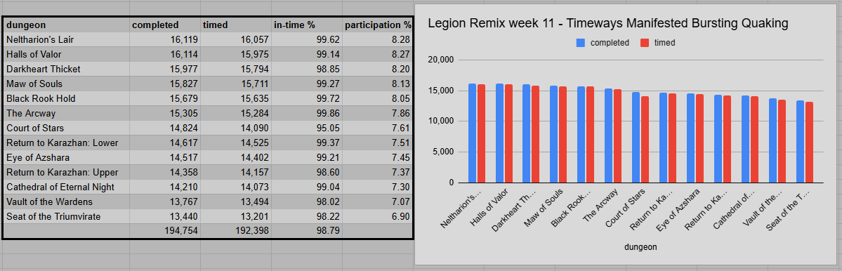 Remix numbers grew more than 50% in the previous week. A drop of around 30% in week 11 brought everything down to almost the same level as in week 9. The final weeks might show us metrics below 100,000. But overall, players have been quite busy in this limited-time M+ mode, racking up almost 6,000,000 runs in total so far.