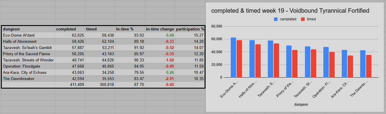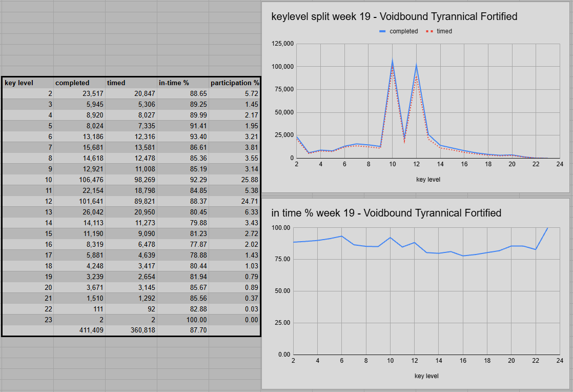 The overall success rate dipped a bit. Down 0.45 percentage points to 87.70%. Voidbound is not that challenging in farm runs, but bad spawns and a lack of focus can turn this affix into an annoying burden. Eco-Dome (93.04%) reclaimed the top spot again, ahead of Gambit (91.92%). Streets of Wonder (90.33%) and Halls (89.18%) had quite a gap towards the lower half. Priory (85.97%) and Floodgate (84.05%) barely moved. But Dawnbreaker (83.47%) saw a really bad performance this week, while still being ahead of Ara-Kara (79.55%).