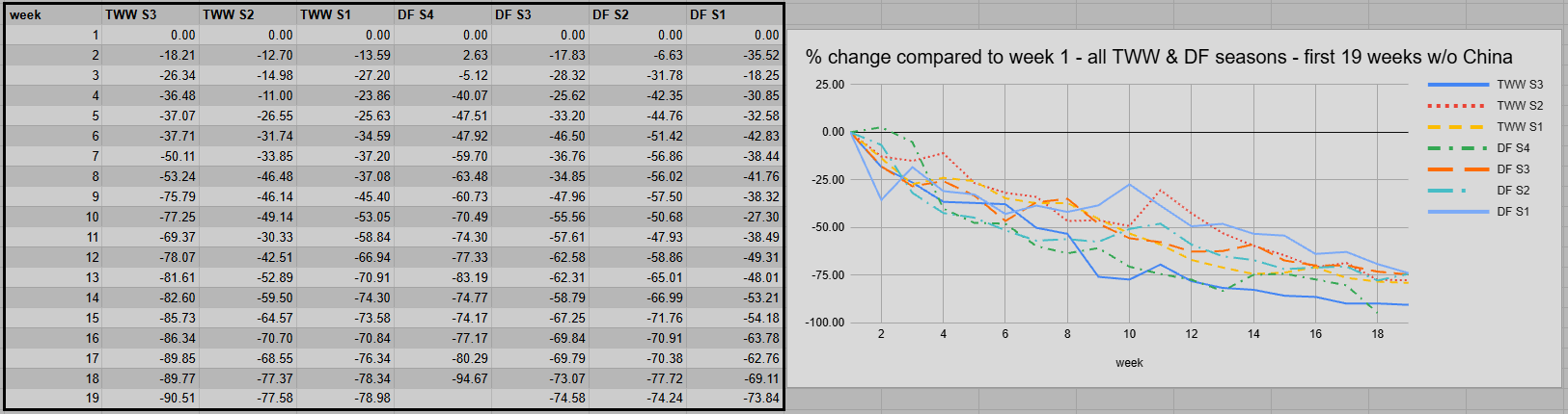 First things first: global activity dropped by 9.06%. Once again, Chinese players are showing a tendency to focus more on Titan Reforged than Retail. Their metrics dropped by 11.27%, while the other regions dropped by 7.20%. TWW S3 is now the sole bottom line for all comparable seasons. But previous seasons never had to compete with something like Remix or the early Housing hype that late into their cycle.