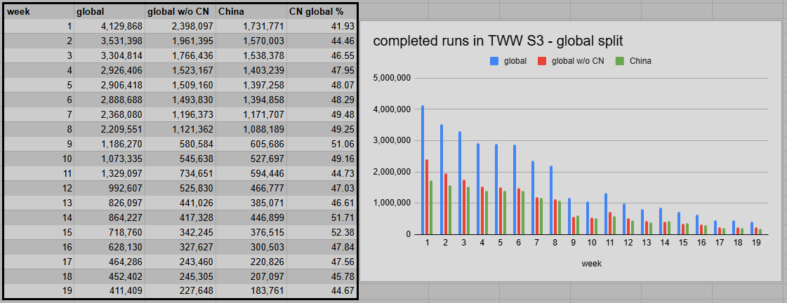 The split across all dungeons widened quite a lot this week. Eco-Dome solidified its position as a quick, easy, and convenient dungeon for this entire season. But it is quite surprising to see Dawnbreaker fall in favor below the shunned Ara-Kara. One major factor could be the even lower participation on the Chinese servers, just 9%, which dragged it down a lot. Also, the two most unpopular dungeons of S3 had been the most popular dungeons during their first appearance in previous seasons. Rebalancing must have gone wrong here.