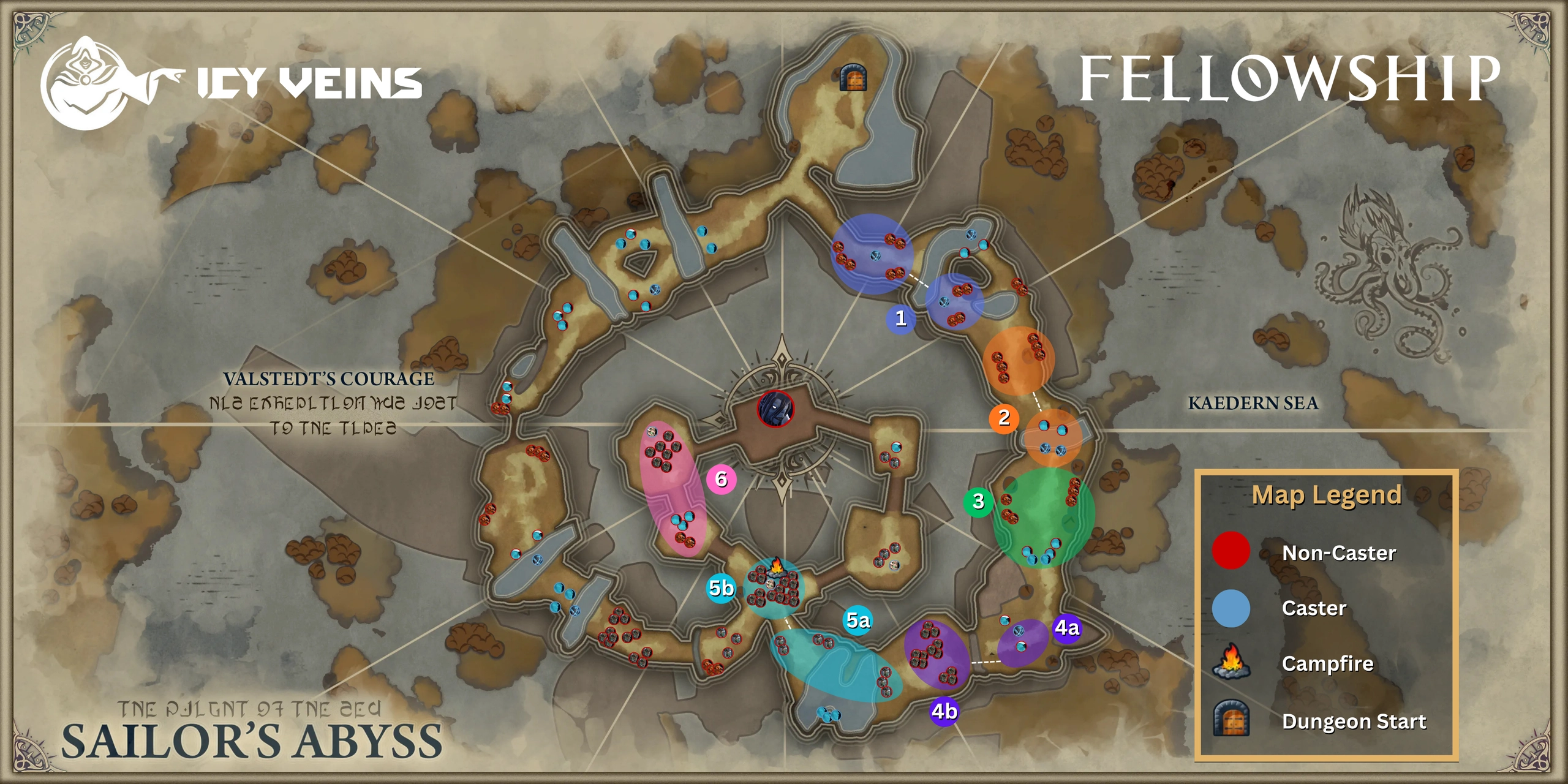 We will go over one of the possible routes in Sailor’s Abyss. When choosing a route to take, we must remember to avoid pulling more than three caster mobs with priority interrupts and avoid overcapping the Kill Score requirement. The route we have chosen optimizes the amount of casters to focus on in each pull and only goes over the Kill Score requirement by 1 point (approximately 0.76%).