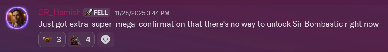 In a developer blog posted on the playfellowship Youtube channel, Chief Rebel’s Community Director Hamish Bode said, “Sir Bombastic will not be granted to you for [your achievement during] Steam Next Fest, but there are ways and he still does exist. So make sure you check out how to get that mount ’cause we know it was a fan favorite.” However, Hamish Bode also stated during a more recent livestream on the playfellowship channel on Twitch: “I don’t think there’s any way to unlock [Sir Bombastic] right now.“ Despite this, players continue on with their search for Sir Bombastic and the conclusion of the skull puzzle.
