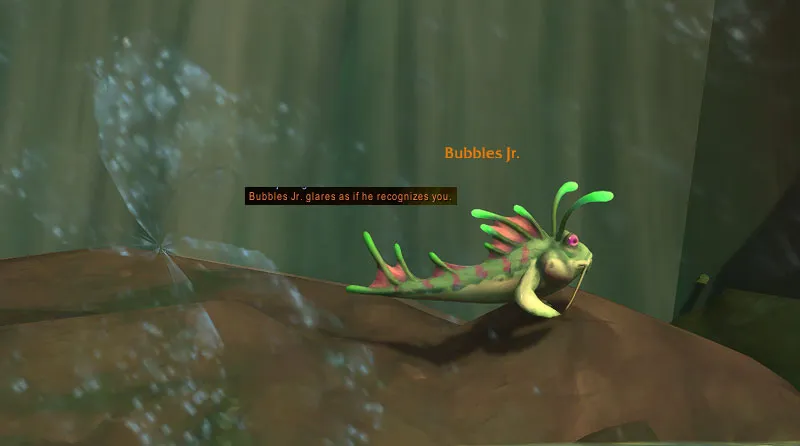 Once again, nothing really happens if you approach Bubbles Jr., besides the quick chat message. However, he has noticeably grown since The War Within. And how did he make his way from Floodgate all the way to the Harandar dungeon???
