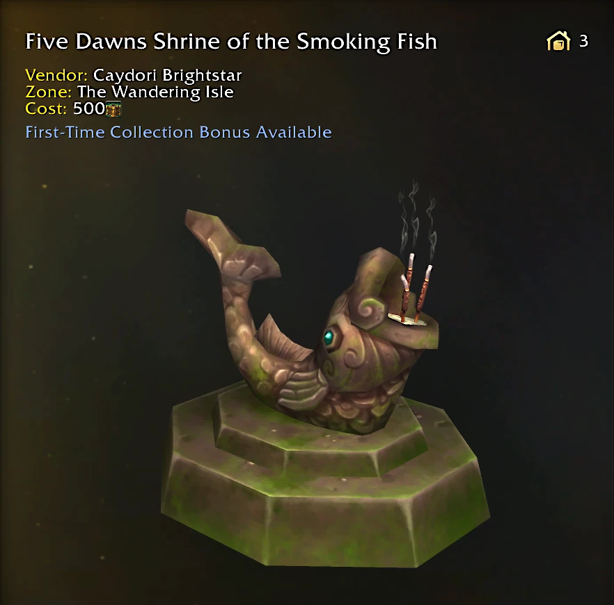 This zen decor features a smoking effect from burning incense sticks in the fish’s mouth, which could be used creatively. The Five Dawns Shrine of the Smoking Fish costs 500 Order Resources.