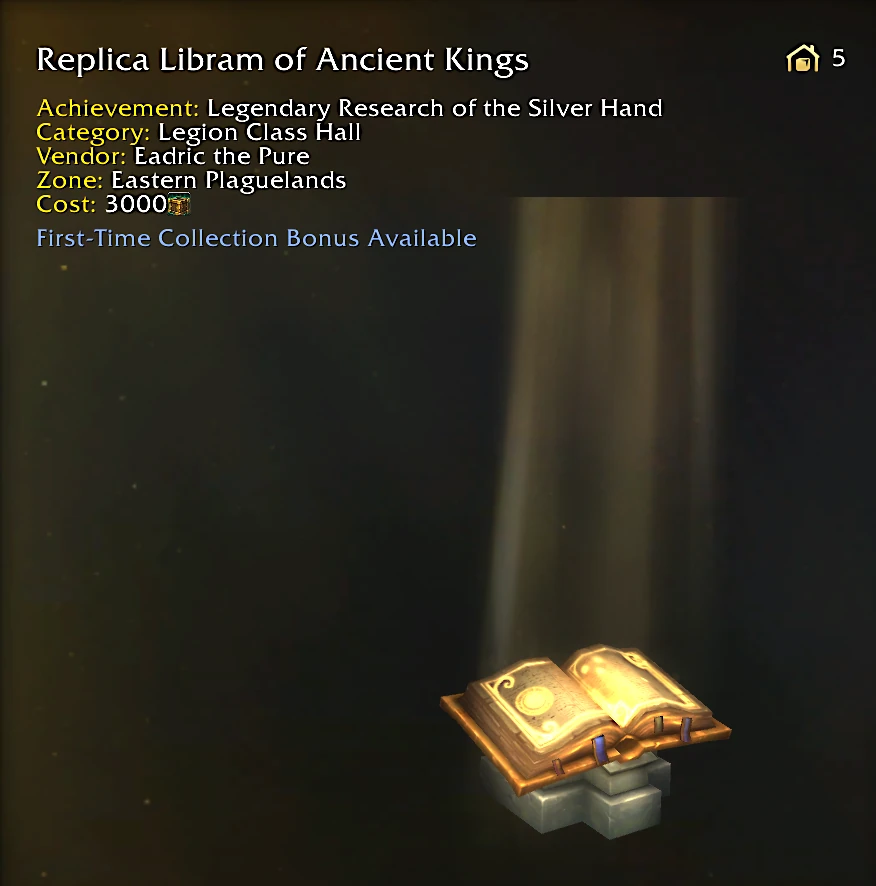 In addition to being used as decor, the light effect generated by this piece can creatively be used as an excellent source of sunlight in a build. Players can unlock The Replica Libram of Ancient Kings by researching all Paladin Class Hall upgrades and earning the Legendary Research of the Silver Hand achievement, to purchase it for 3,000 Order Resources.
