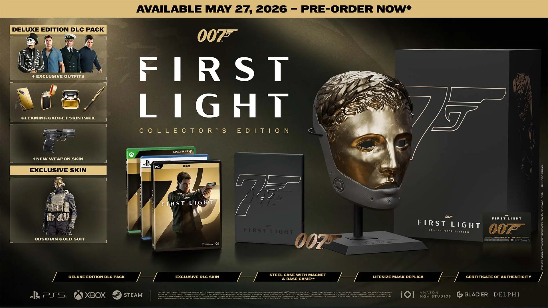 007 First Light is coming to PS5, Xbox Series X/S, PC, Nintendo Switch 2, and Xbox ROG Ally devices. If you pre-order the game, you will be upgraded to the Deluxe Edition at no extra cost, and that includes 24-hour early access, 4 exclusive outfits, a gleaming gadget skin pack, and 1 new weapon skin!