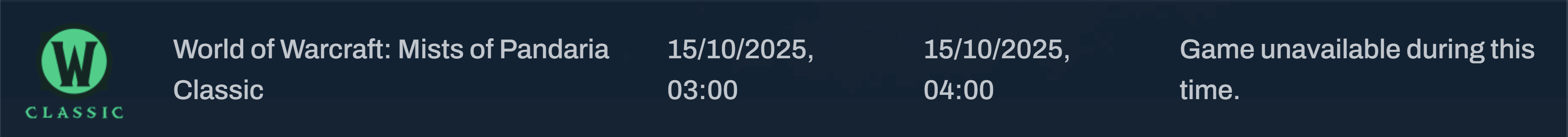 All Mists of Pandaria WoW realms will undergo 1-hour maintenance this week, with no new content being added to the game.