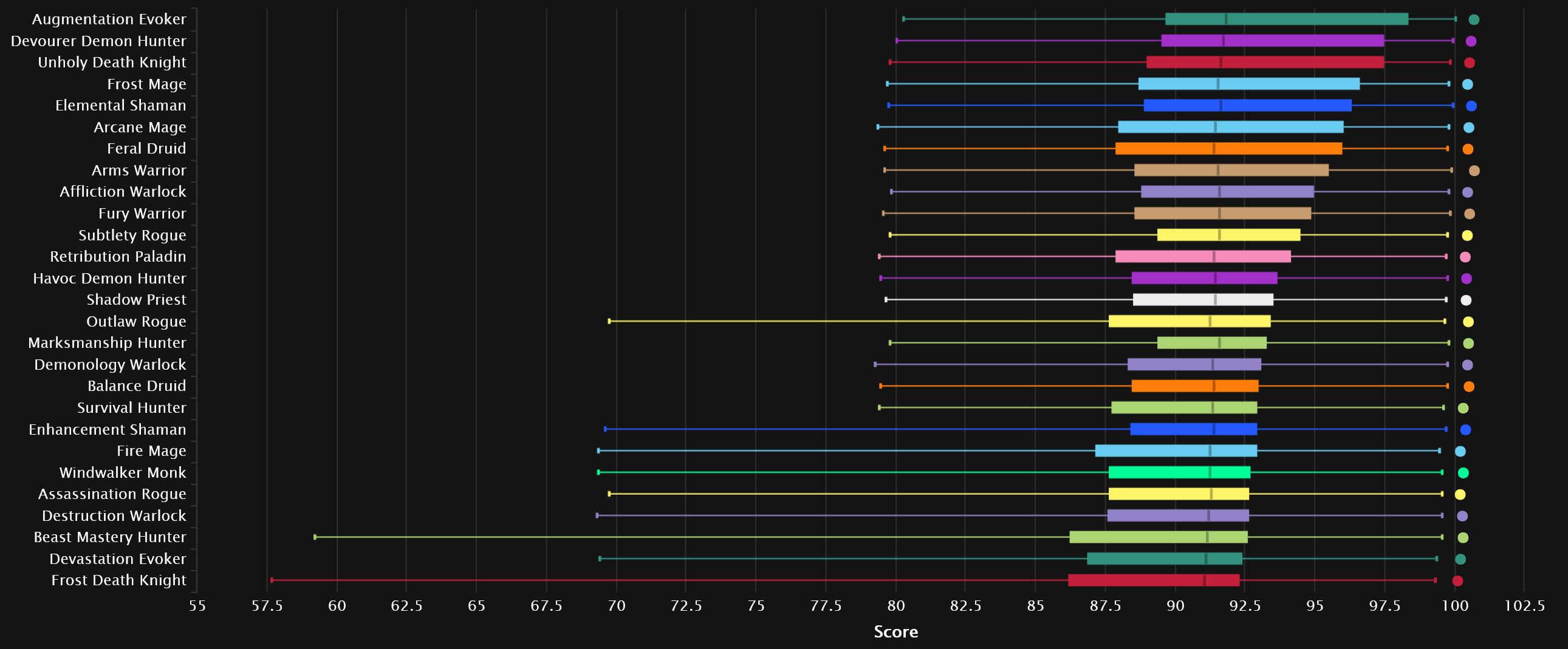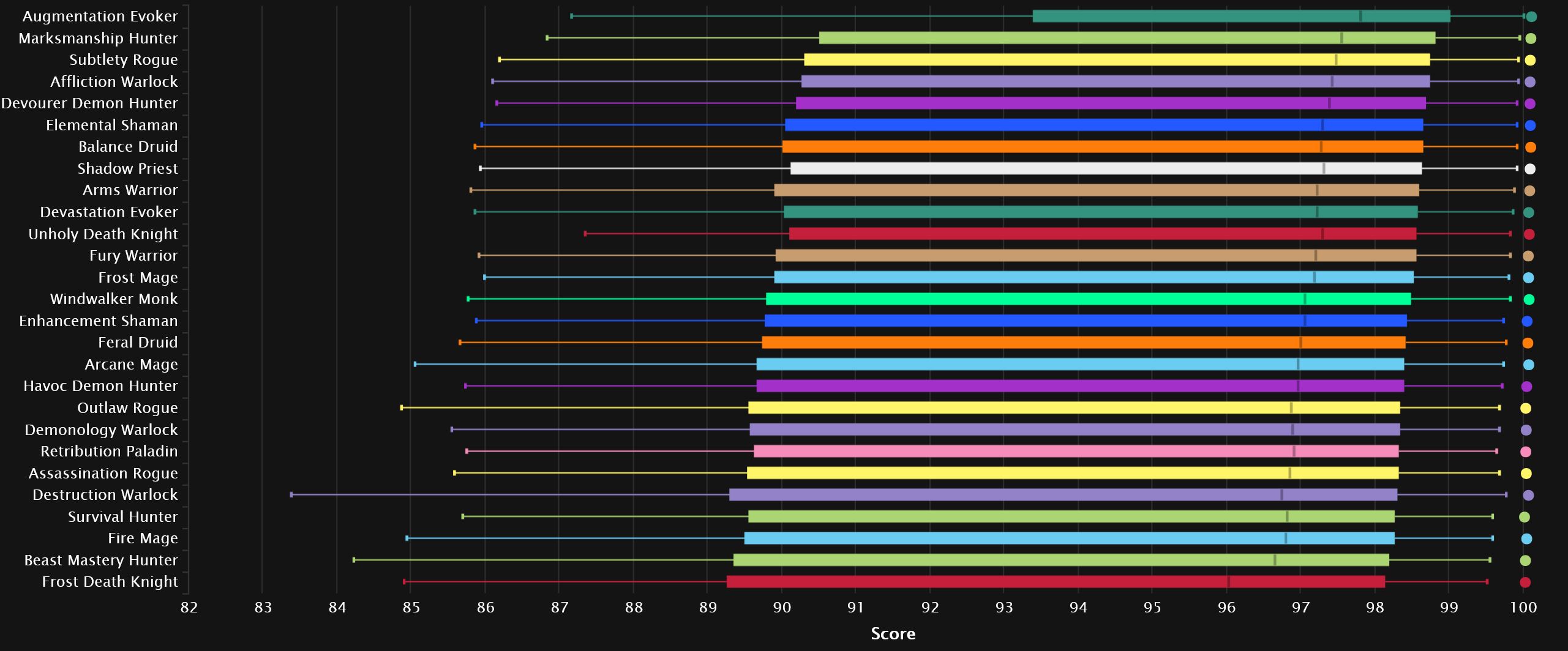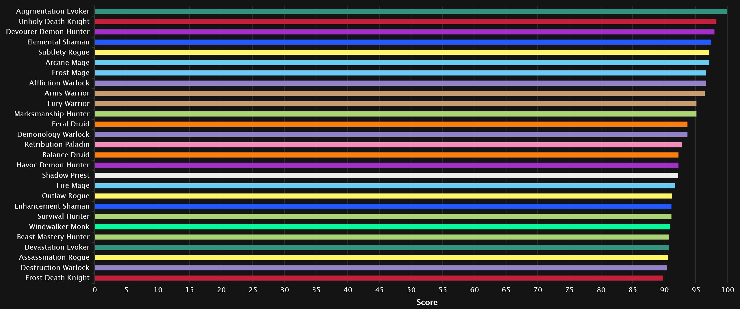 While we see one familiar face in the top 3, the other two are very new to this particular neck of the woods. Augmentation spent a long time near the bottom, especially in TWW Season 3, and seeing it at the very top is unusual to say the least, not to mention ahead by a significant margin! The other new face is just new in general, as Devourer claims 3rd, neck and neck with the DK. Elemental and Subtlety follow the top 3. And, along with Arcane right after that, they are all pretty used to relatively high placement. The next spec, on the other hand, is coming straight from the bottom of the previous season, as Frost Mage is ready to make a name for itself. The Warriors huddle up behind Affliction and it’s Fury that closes out the top 10.
