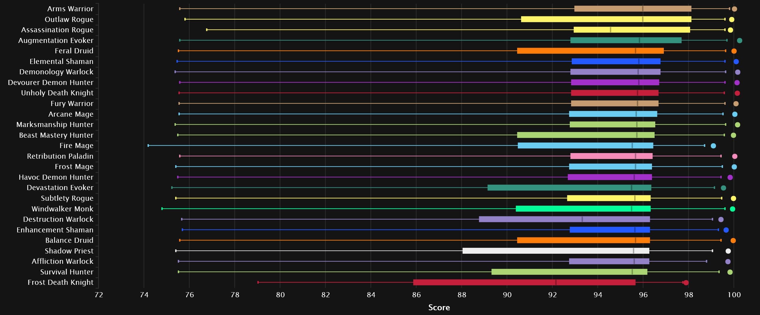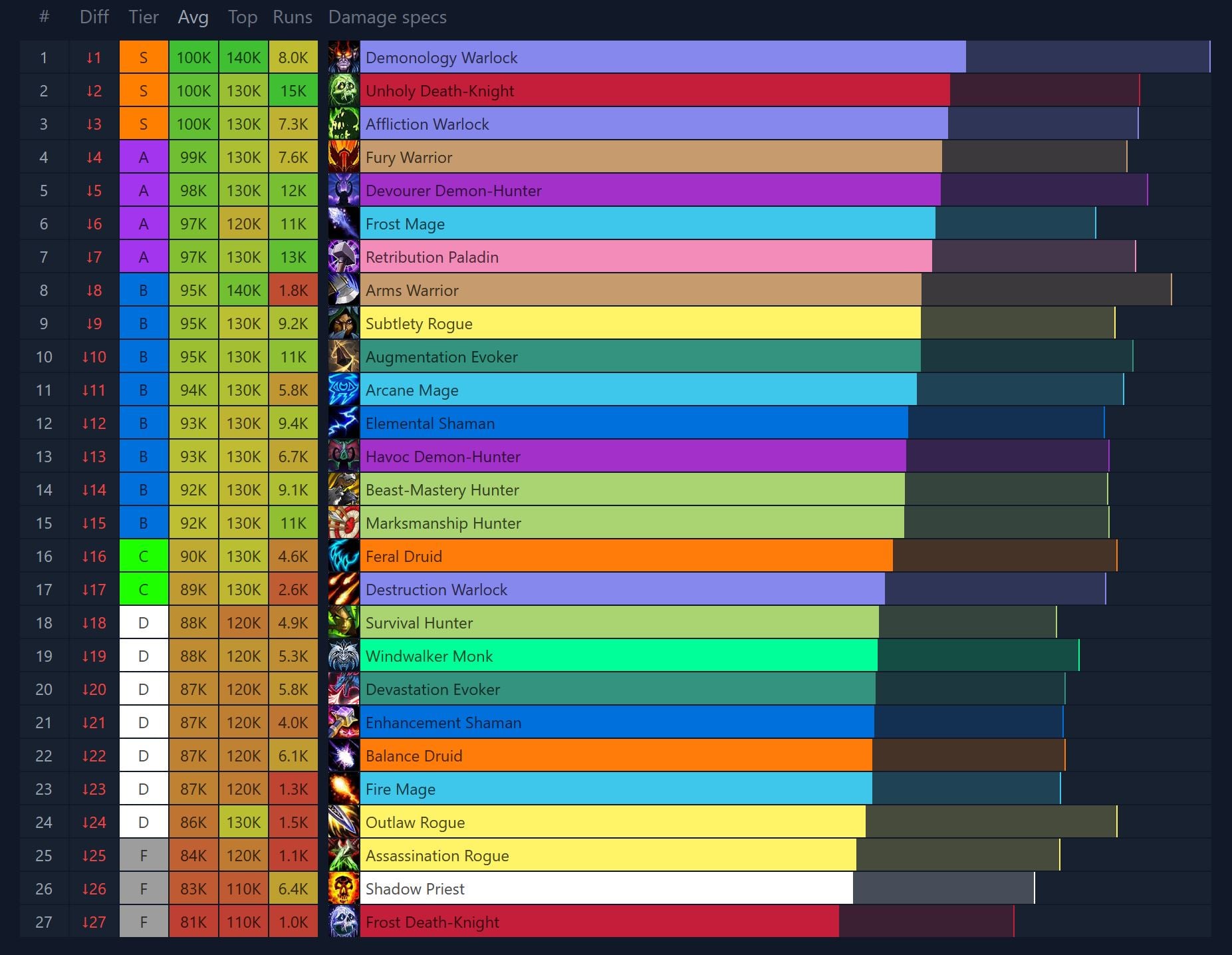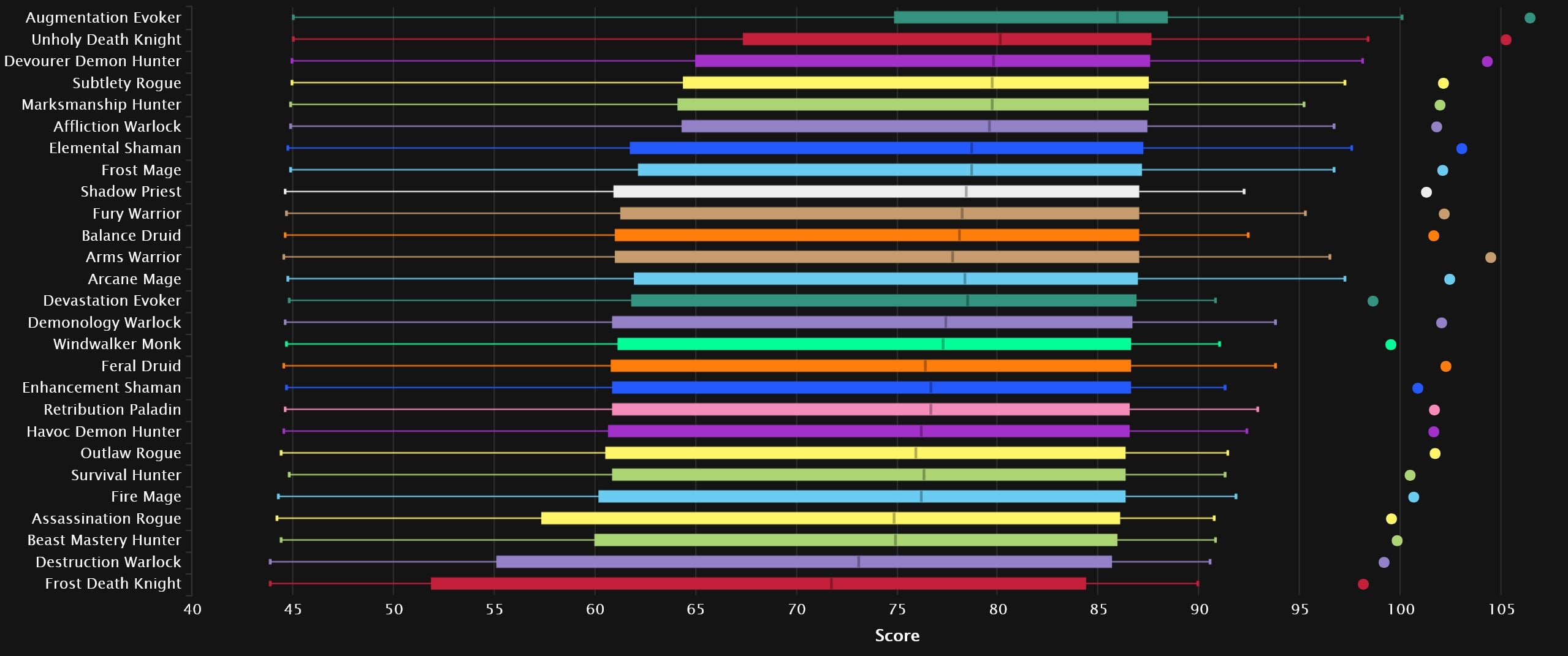 While we see one familiar face in the top 3, the other two are very new to this particular neck of the woods. Augmentation spent a long time near the bottom, especially in TWW Season 3, and seeing it at the very top is unusual to say the least, not to mention ahead by a significant margin! The other new face is just new in general, as Devourer claims 3rd, neck and neck with the DK. Elemental and Subtlety follow the top 3. And, along with Arcane right after that, they are all pretty used to relatively high placement. The next spec, on the other hand, is coming straight from the bottom of the previous season, as Frost Mage is ready to make a name for itself. The Warriors huddle up behind Affliction and it’s Fury that closes out the top 10.