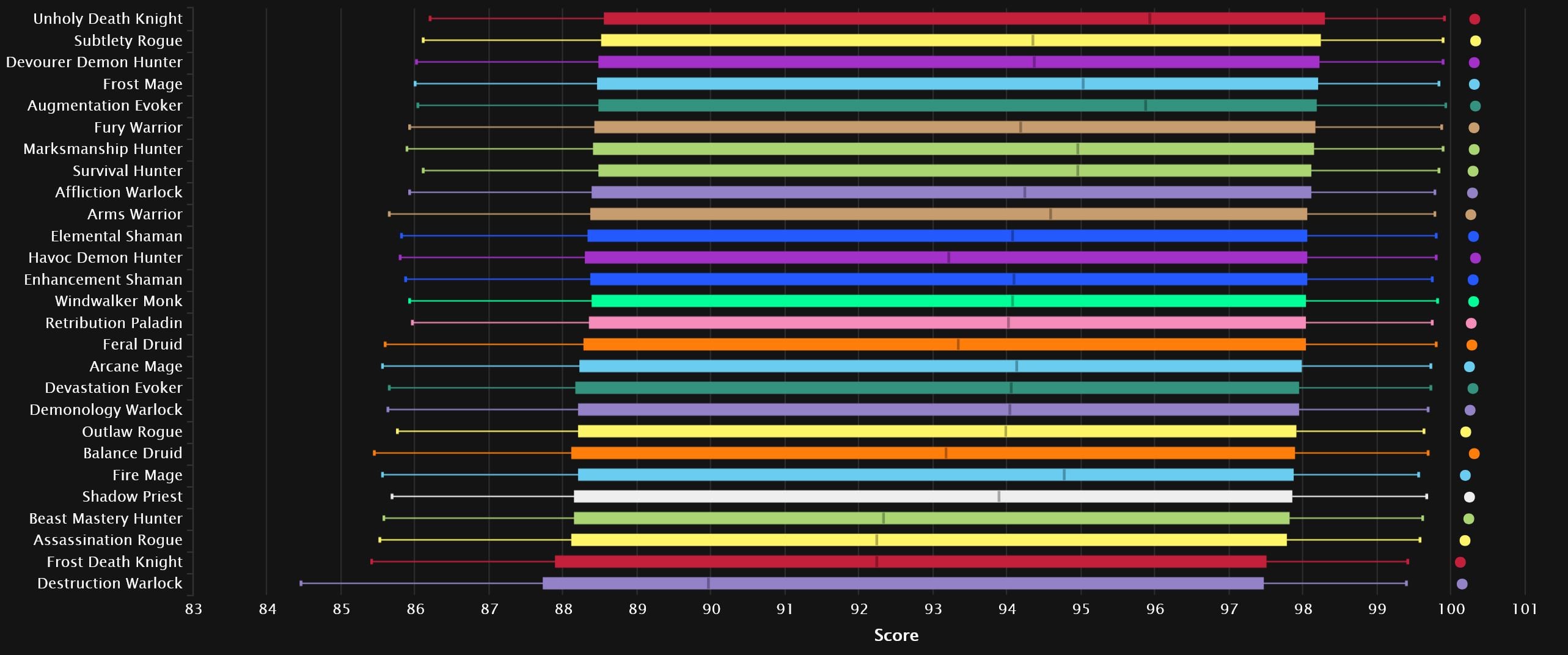 The top 3 remain the same here, with Augmentation not as far ahead as in the top percentiles. Subtlety is doing better here, as Elemental drops off a few spots. We also see Marksmanship doing a lot better than in the above chart! Shadow also makes an appearance in the top 10, just ahead of Fury, which takes the final spot once again. The one thing that’s very consistent between the two charts is Frost DK sitting at the very bottom (and that 4% buff this week doesn’t look like it’ll help much), Destruction joining it. And while the top percentiles had Assassination as the third in the bottom three, here we see Beast Mastery joining the very much not fun.