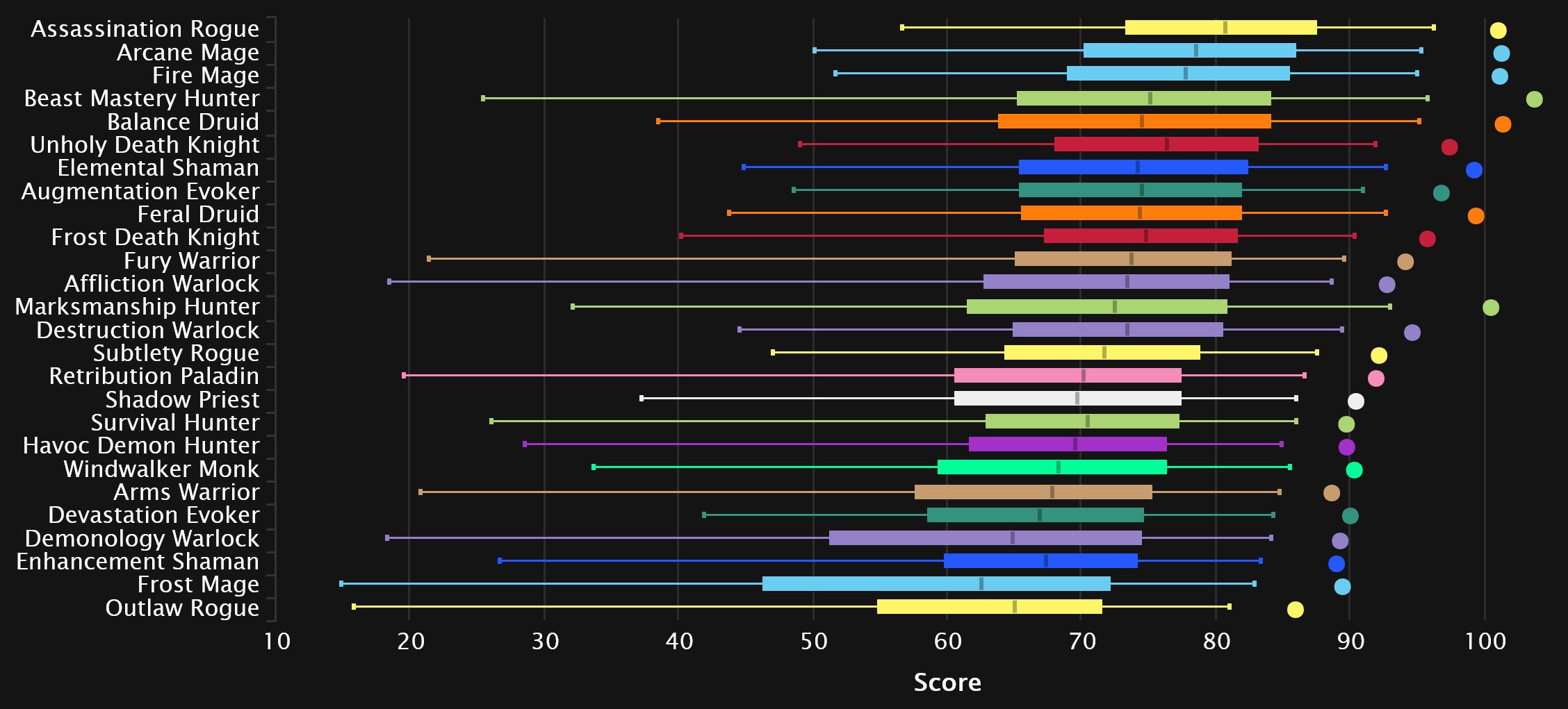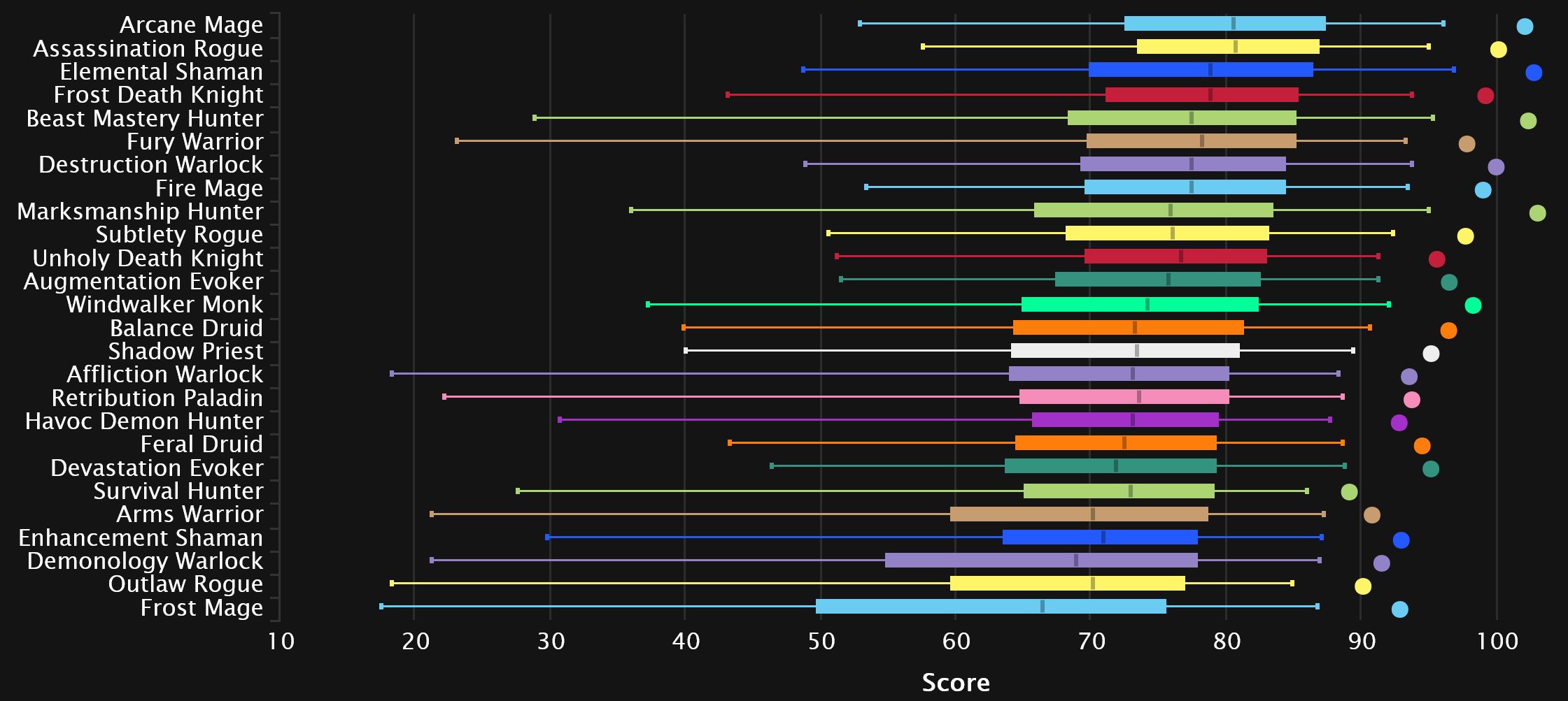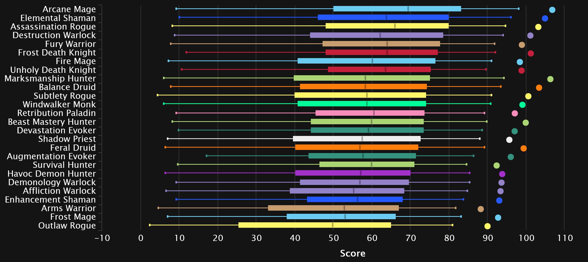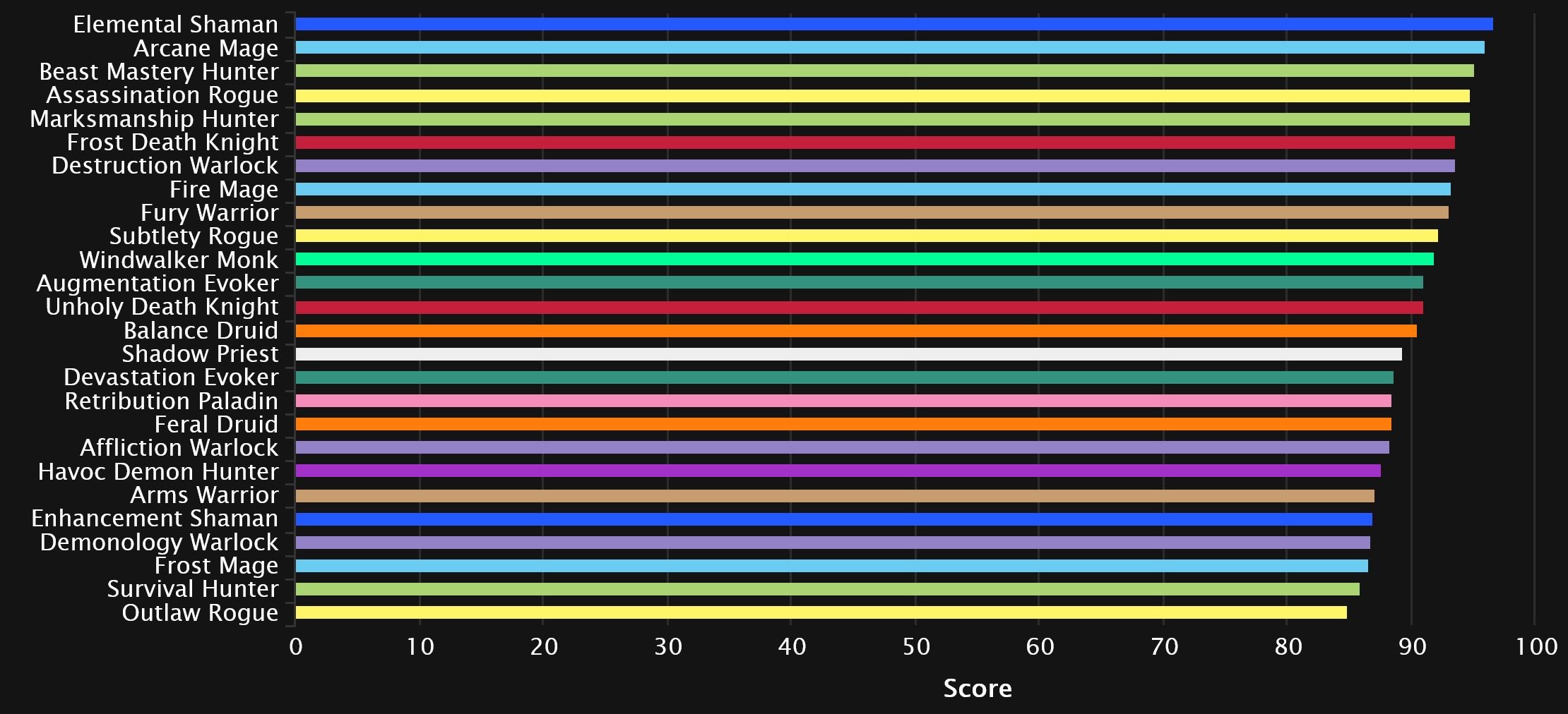 Despite the new meta being in place for a long time now, the generalist chart will not budge, and Elemental remains in 3rd, with Arcane and Assassination being very stable at the top. We usually see it catch up to the top percentiles eventually, but it seems it may be resisting that trend this season. Fury drops a couple of spots to 6th, while BM drops one to Frost DK. We see Marksmanship drop here as well, two spots down to 9th. Subtlety gains one to finish at the end of the top 10, knocking Unholy down.