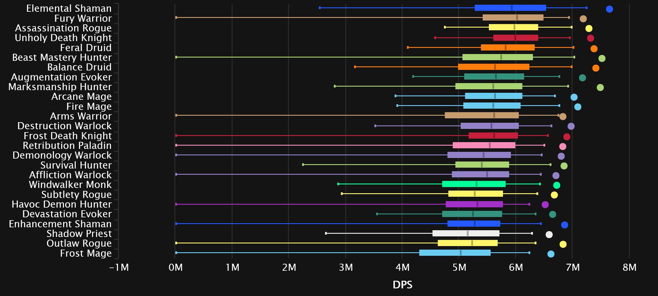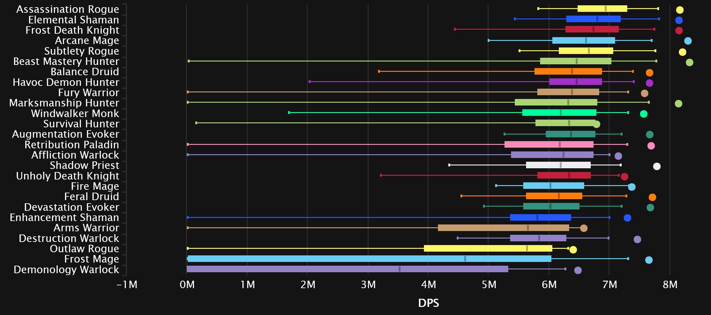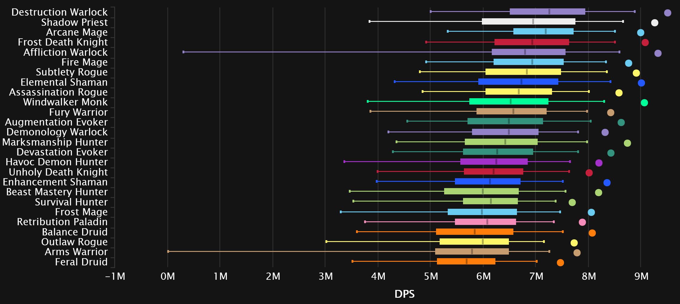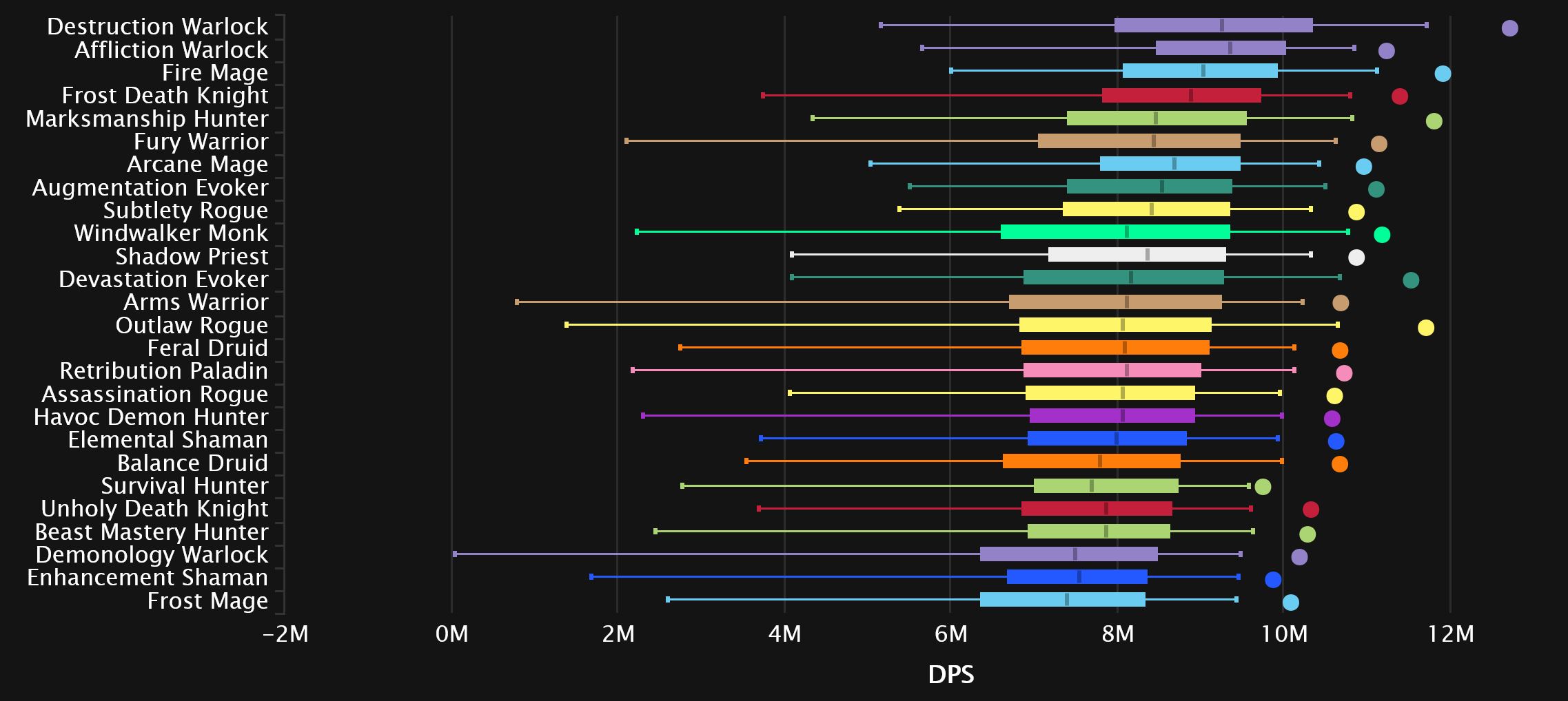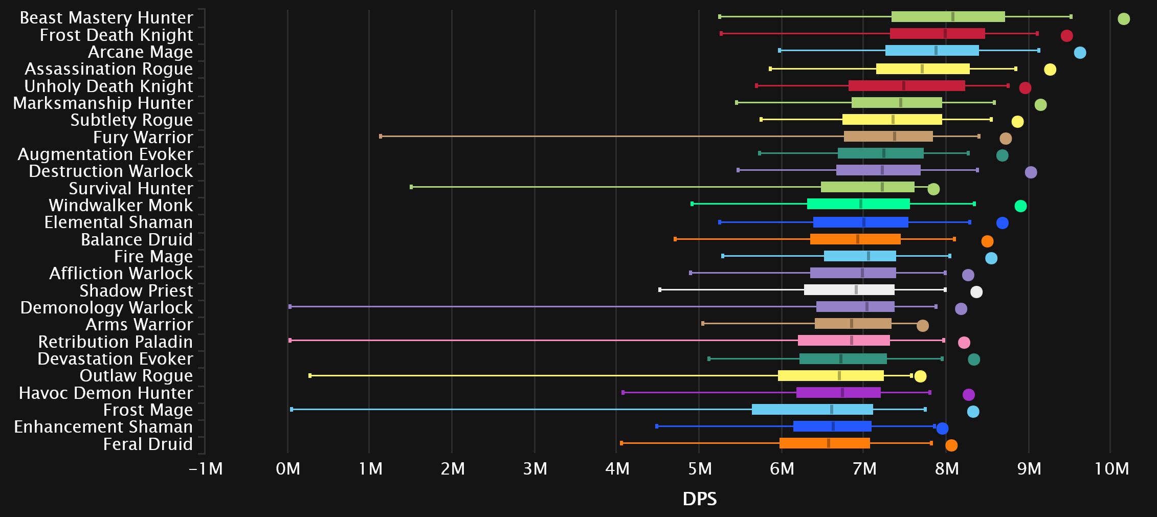 Down at the bottom, we see Arms move out of the gutter, a pretty big 5 spots up from dead-last, as some 0 DPS Dimensius carries may have gone away. The current occupant of that last spot is not there due to Dimensius shenanigans, as Outlaw is hovering around that final spot on basically every single fight in the raid.