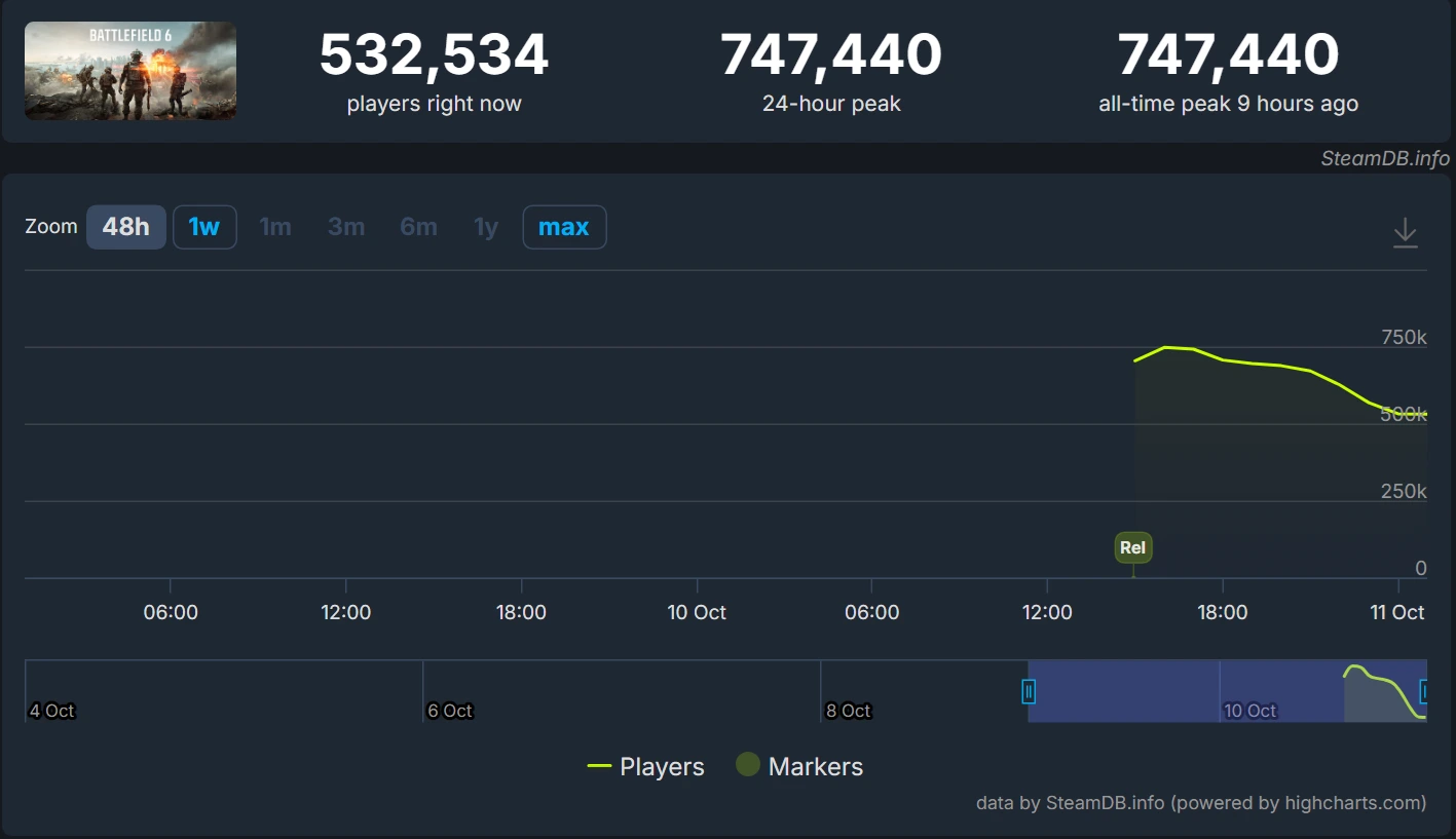 This makes Battlefield 6 EA’s biggest Steam launch ever, beating Apex Legends’ all-time peak of 624,000. This, of course, is just on Steam alone, so factor in the number of players also on console, and using the EA app.