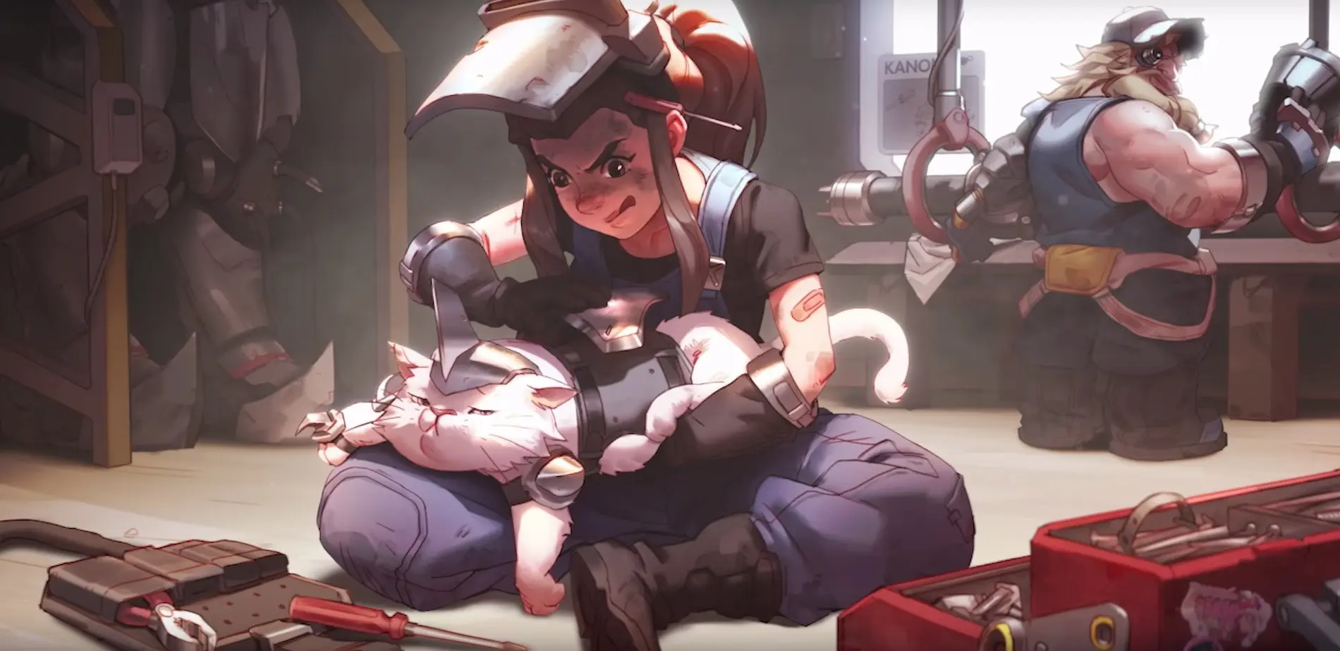 According to the video, Brigitte rescues a stray cat from rocket debris at Gibraltar. Inspired by old childhood jetpack designs, she decides to build a propulsion rig. The cat, named Fika, “helps” solve engineering issues by knocking over blueprints. Brigitte designs stabilizers, tail-weight balancing, and even a joystick usable without opposable thumbs. She also adds grappling tech to keep up when Reinhardt inevitably charges ahead. Healing projectiles are even dubbed “purr-jectiles.”