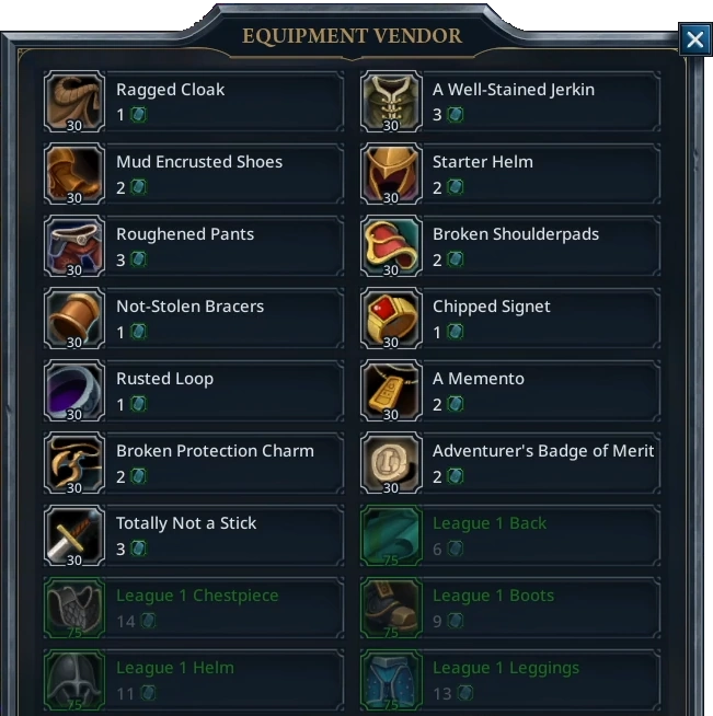 These basic items are best used to fill empty slots. The level limit of the gear you can buy increases based on your account’s progression. League 1 gear for example is purchased after completing Contender +7 on your account. Note that League 1 gear when purchased is still Common. Common items cannot be upgraded.