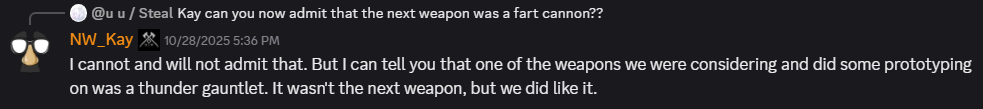 Since these updates made it with in the game, the community also got a few easter eggs of a few updates that were planned and “in the works”. These communications were primarily shared directly through the official New World: Aeternum Discord.