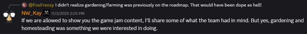 Another fun preview the community received from Discord was a quick tease on two additional tradeskills that were potentially going to be added to the game – gardening and homesteading!