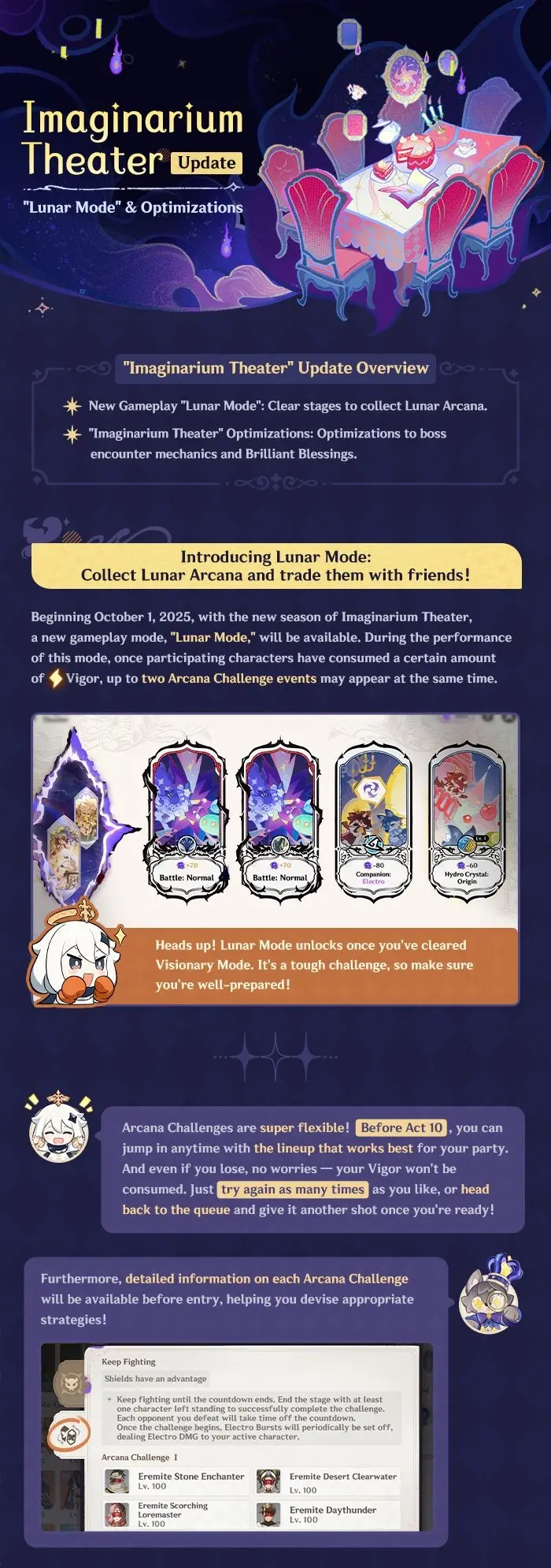 On October 1, 2025, Genshin Impact will launch a new season of the Imaginarium Theater, featuring the all new Lunar Mode. This gameplay mode introduces tougher challenges, unique rewards, and more flexibility for players.