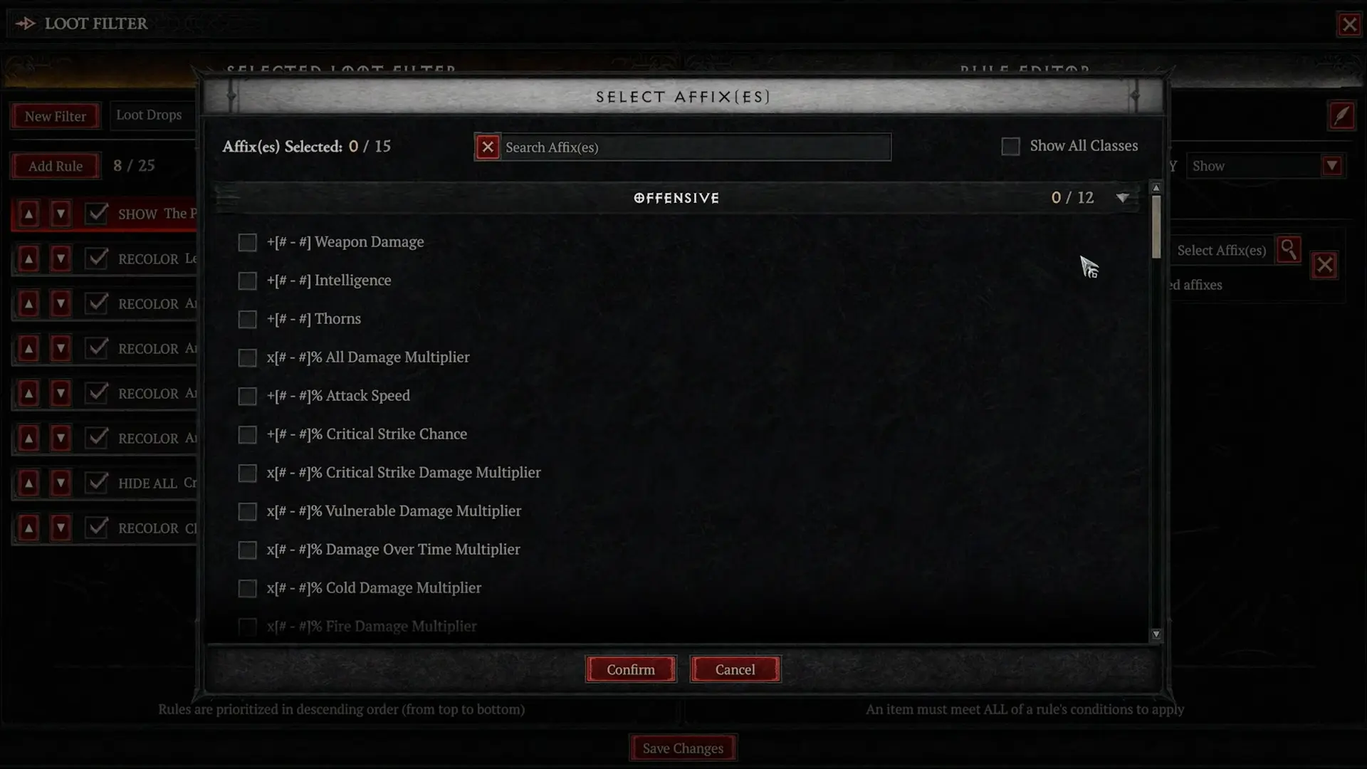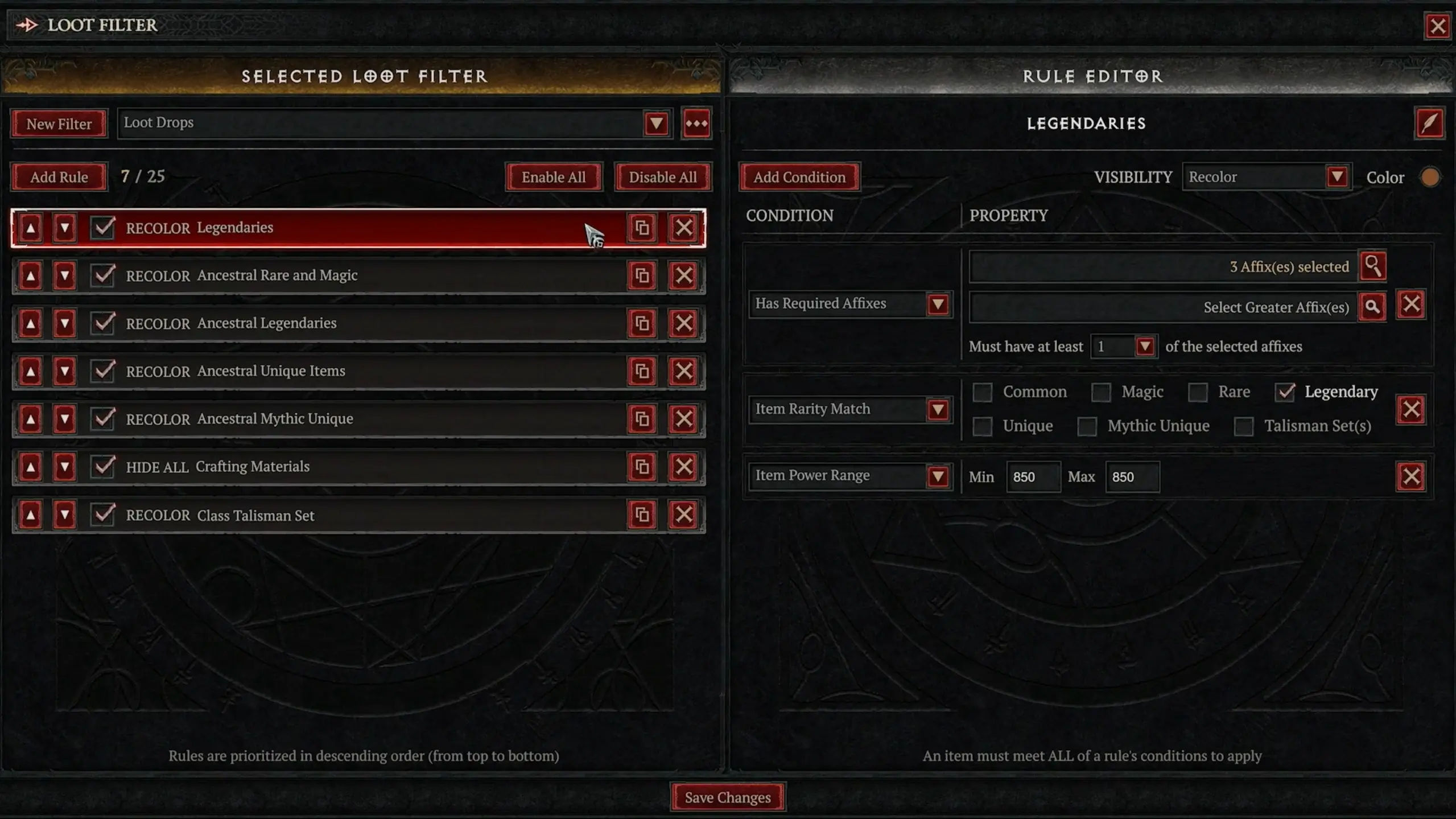 Class-specific options like Uniques and Talisman Set Bonuses only display for the class you’re currently on, but alts from other classes can add their own targets to the same rule without disrupting it. This means one shared filter can serve many characters.