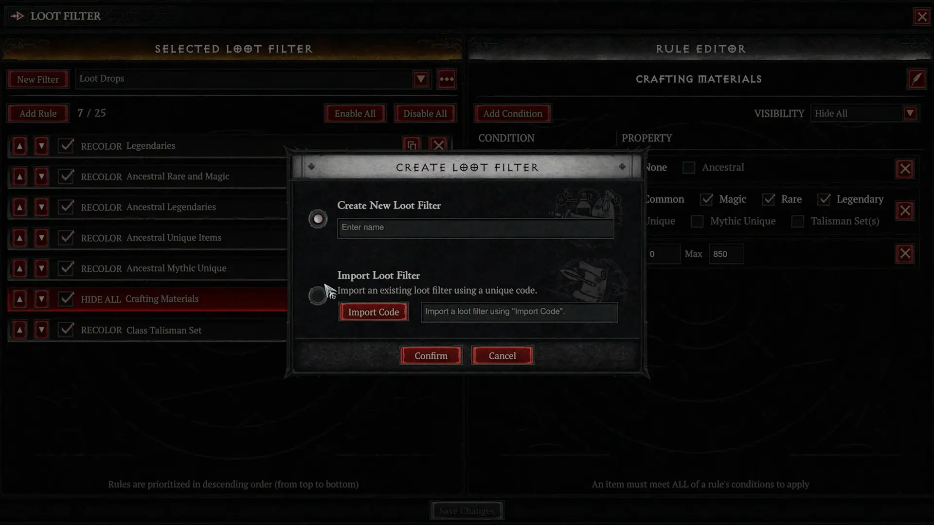 One of the most community-friendly aspects of the system is that you can export filters as a string to share with friends, or import filters built by other players. Exporting copies the string to your clipboard, and importing is as simple as creating a new filter and pasting in the code.