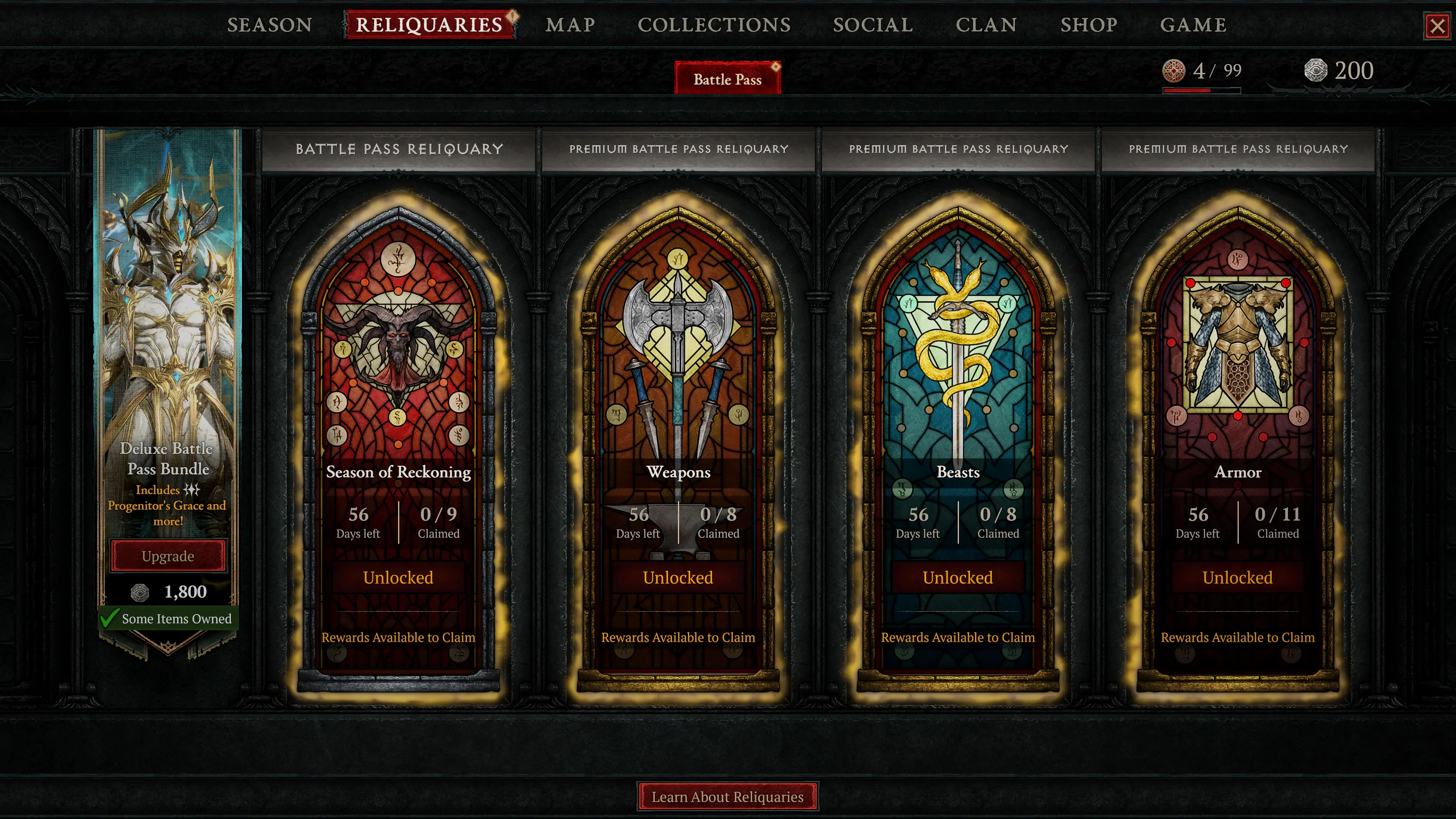There are two ways to earn it. Players can unlock all four Reliquaries (the free Season of Reckoning track plus all three premium tracks) to claim the set as a completion reward, or grab the Deluxe Battle Pass Bundle for instant access.