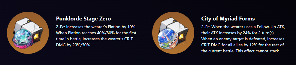 2-Piece: “Increases the wearer’s Elation by 10%. When Elation reaches 40%/80% for the first time in battle, increases the wearer’s CRIT DMG by 20%/30%.”
