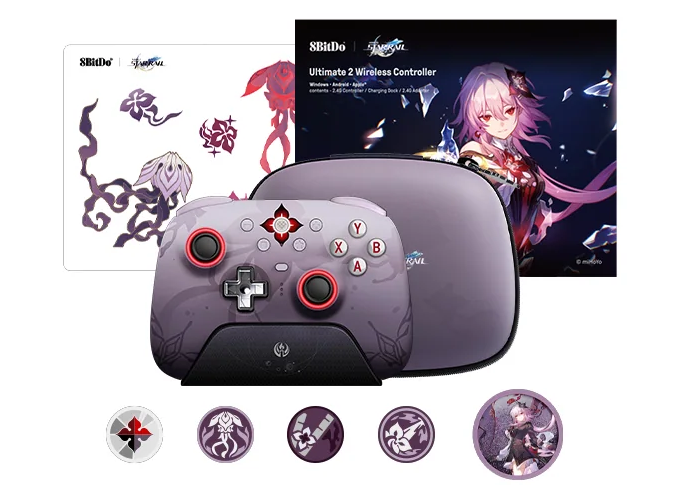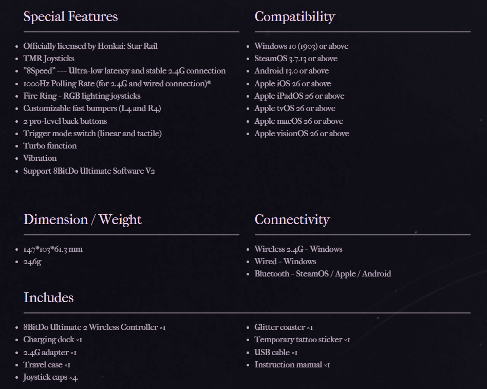 The 8BitDo Ultimate 2 Wireless (Honkai: Star Rail edition “Evernight”) comes with these great features: TMR joysticks, ultra low latency, wireless, 1000Hz polling, customisable bumpers, dual back buttons, RGB lighting, turbo functionality, vibration, and trigger mode switching. It works with Windows, SteamOS, Android, and Apple devices, Bluetooth, or wired connections.