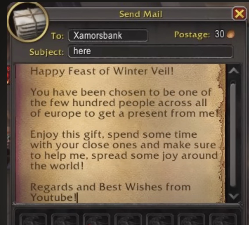 GarroshTV decided to give away five gifts per realm, with each gift valued at around 43,000 gold. He planned everything well in advance, ensuring the video would be ready by Christmas when the Feast of Winter Veil began on December 19.