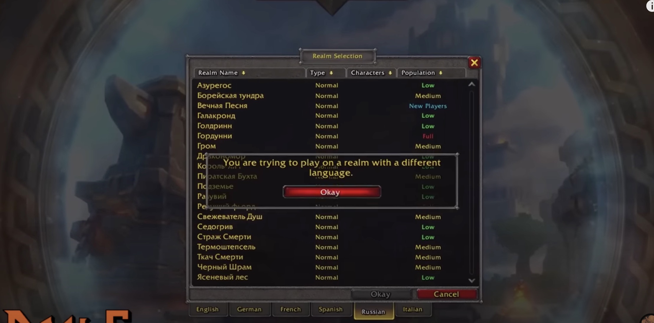 Spanish and Italian realms were no problem. But Russian servers were complicated. First, you cannot join a Russian server before changing your language in the game setting and the game needs to download additional data, which takes around 30 minutes.