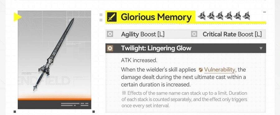 Glorious Memory is an Agility-scaling Sword designed for the upcoming Physical Guard, Rossi. For its Secondary stat, it boosts Critical Rate. Its skill, Twilight: Lingering Glow, increases Attack. Additionally, when the wielder’s skill applies Vulnerability, the damage dealt during the next ultimate cast within a certain duration is increased. For Rossi this means that, after she’s used her Moment of Blazing Shadow combo skill, she’ll be able to deal far more increased damage with her “Razorclaw” Ambuscade ultimate.
