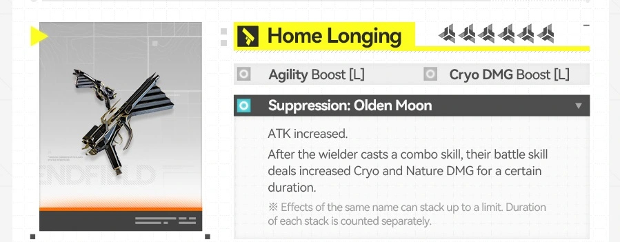 Home Longing is an Agility-scaling Handcannon designed for the upcoming Cryo Caster, Tangtang. For its Secondary stat, it boost Cryo Damage. Its skill, Suppression: Olden Moon, further increases Attack. Additionally, after the wielder casts a combo skill, their battle skill deals increased Cryo and Nature Damage for a certain duration. So after Tangtang’s used her RIVER, TO ME! combo skill and deploys a Whirlpool, she’ll be set to use her IMA WAVERIDAAH! battle skill to perform a much more powerful hit.