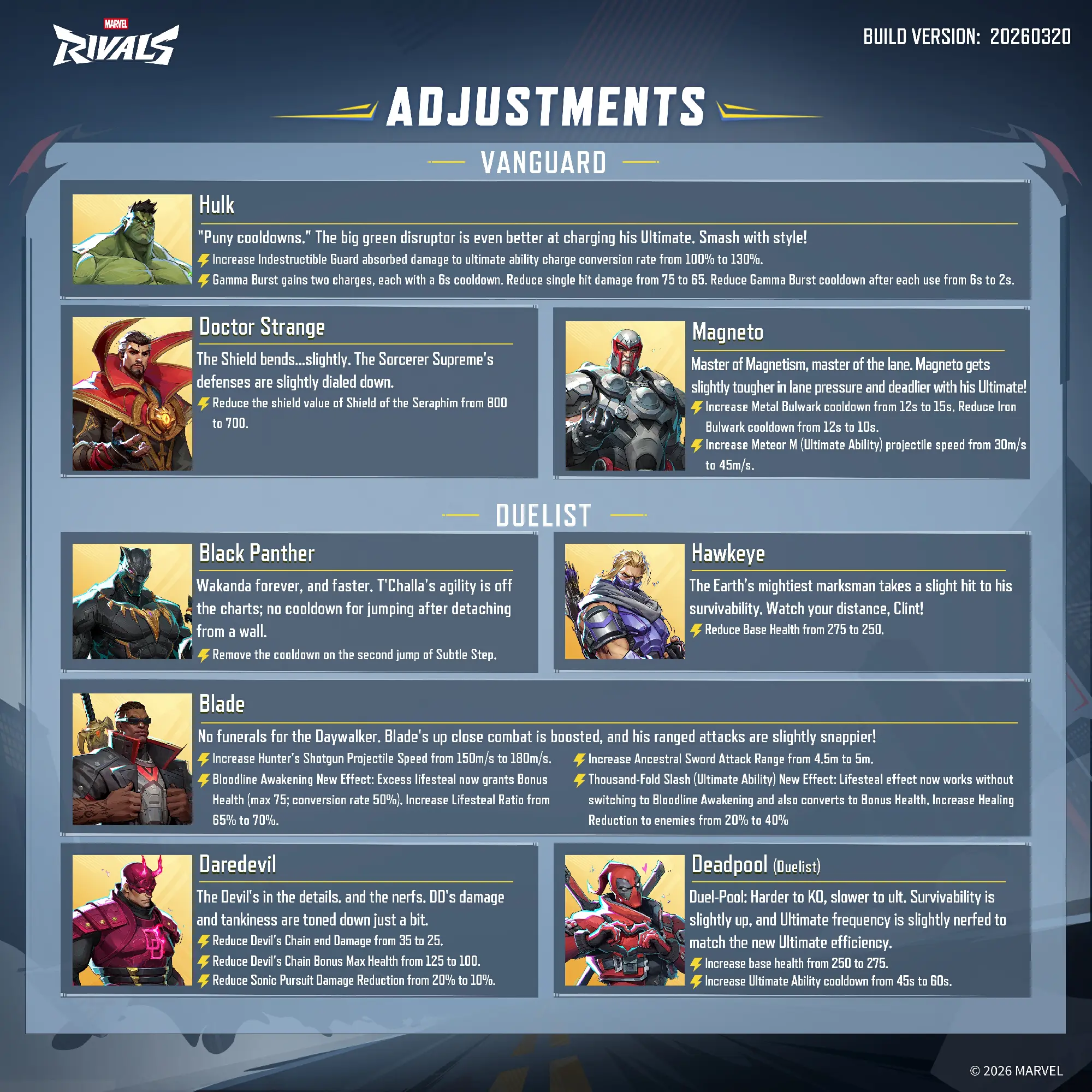 The biggest changes for Vanguard are Deadpool (Vanguard) & Emma Frost’s Damage Reduction abilities are scaling down. Hulk gains 2 charges of Gamma Burst, and Magneto’s Ult has a higher projectile speed.