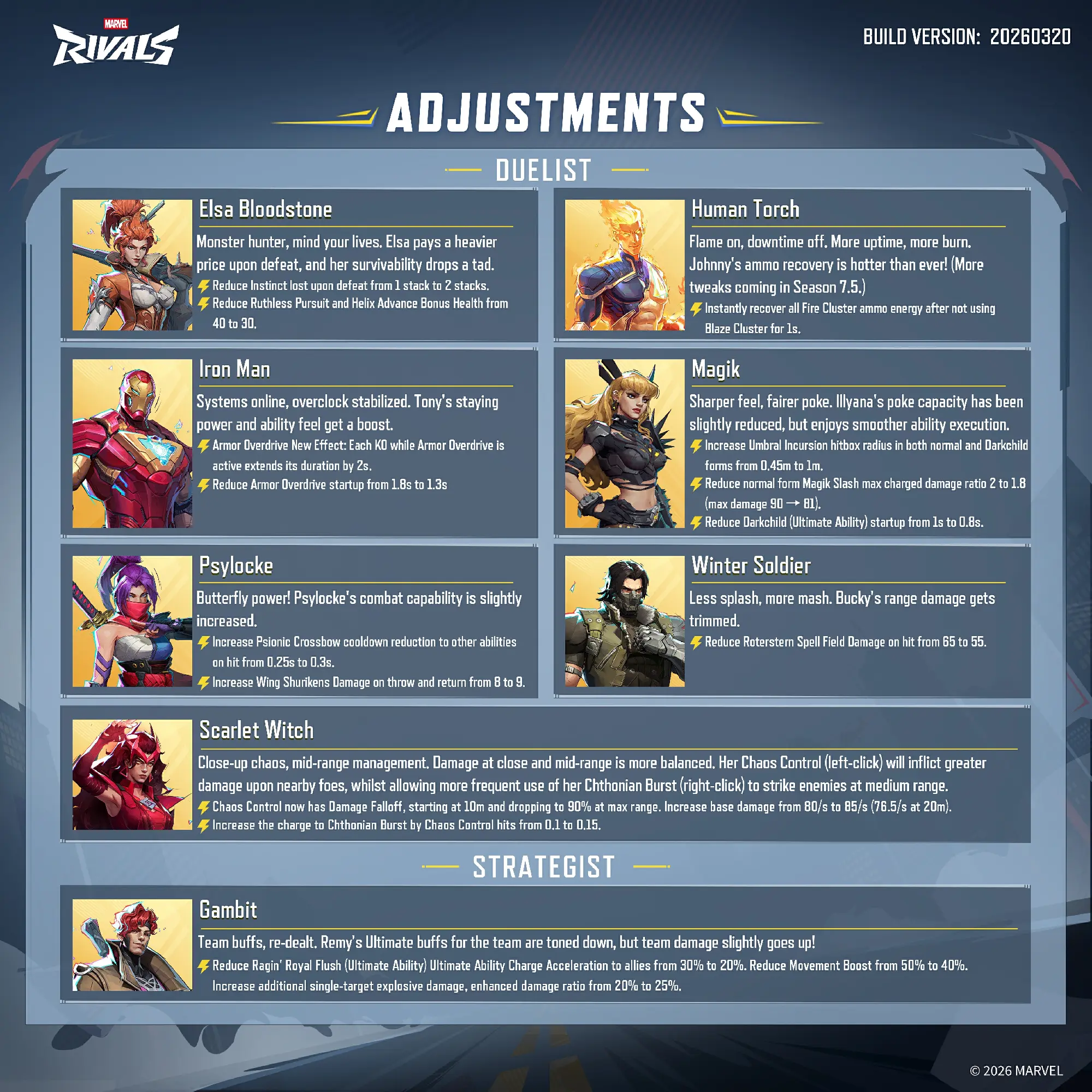 Elsa Bloodstone losses less stacks on death. Iron Man’s Armor Overdrive’s active effect extends with each takedown. Human Torch now recovers all Fire Cluster ammo after not using Blaze Cluster for a second. Psylock gets more cooldown reduction & Scarlet Witch’s left click now has fall off, but does more damage up close.