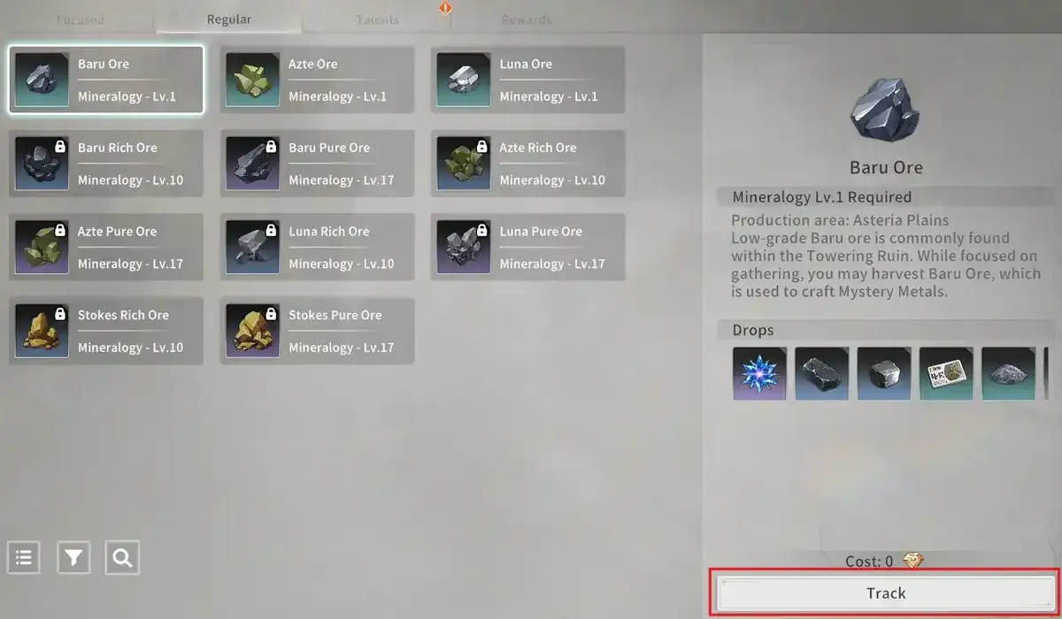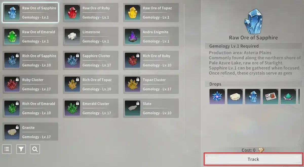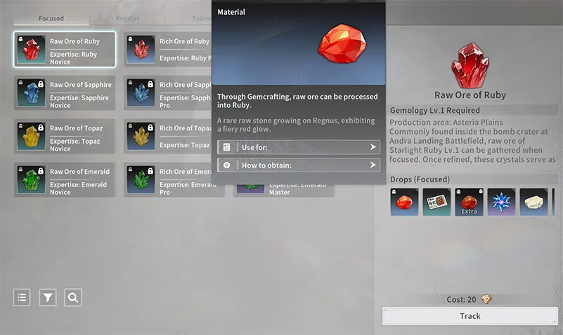 Gemology is all about harvesting raw minerals from gemstone veins scattered throughout the open world. These nodes respawn infinitely, and you can easily track them down using the game’s tracking feature.